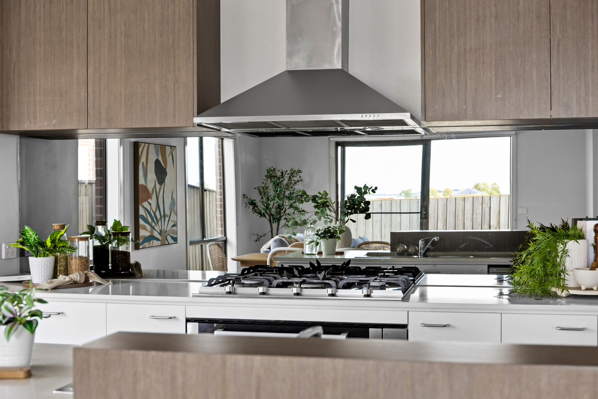 Kitchen: Open plan, 20mm stone benchtops throughout, island bench with breakfast bar with breakfast bar overhang and pendant strip lighting, 900mm gas cooktop/oven/rangehood, thoughtfully designed cabinetry throughout, mirror splashback, double sink, ample shelving, timber laminate flooring and downlights
