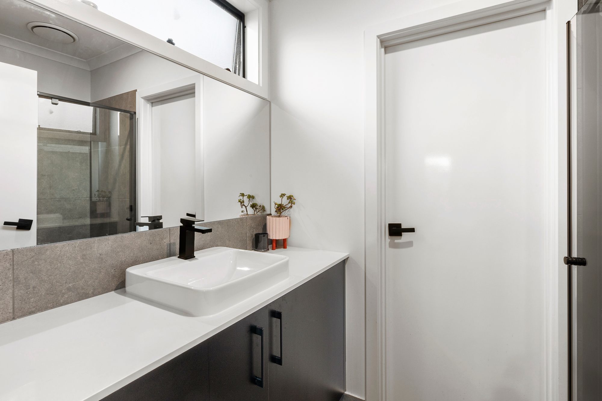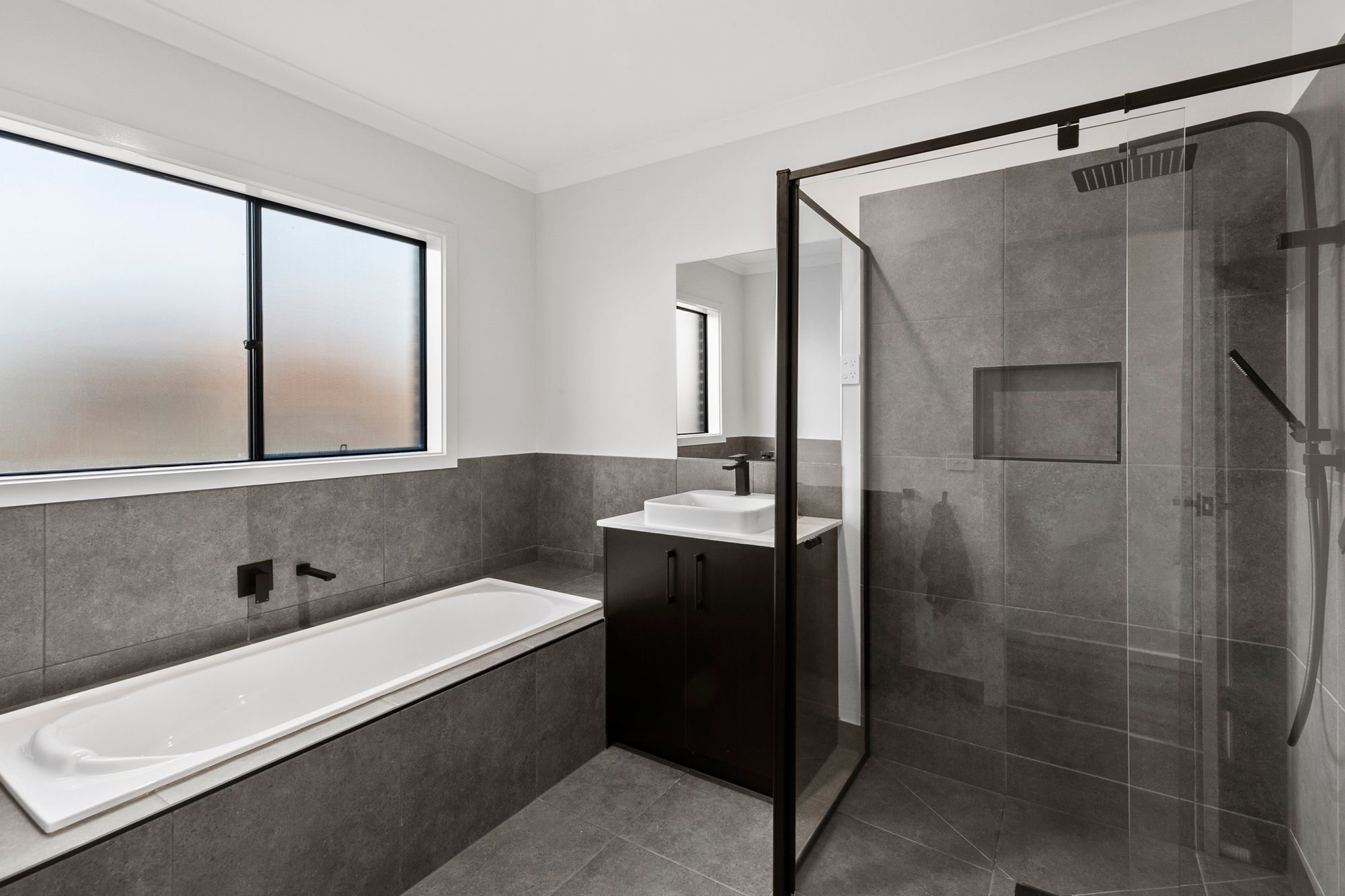 Main bathroom: 20mm stone benchtops, single vanity, matte black tapware, fittings & trim, mirror & tile splashback, large semi-frameless shower with niche, feature dual shower heads, bath, separate toilet with soft close seat