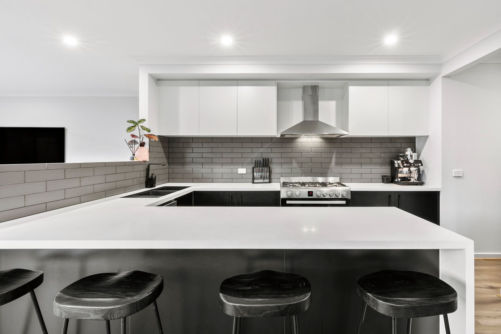 Kitchen: Premium wrap-around 40mm stone bench with waterfall & breakfast bar overhang, 900mm gas stovetop, oven & rangehood, feature subway tile splashback, ample overhead & under bench cabinetry, dual matte black inset sink, matte black fittings & tapware, raised ceilings throughout, feature pony wall overlooking second living, walk-in pantry with ample shelving & storage, dishwasher, downlights, pull-out bin, stylish timber laminate flooring