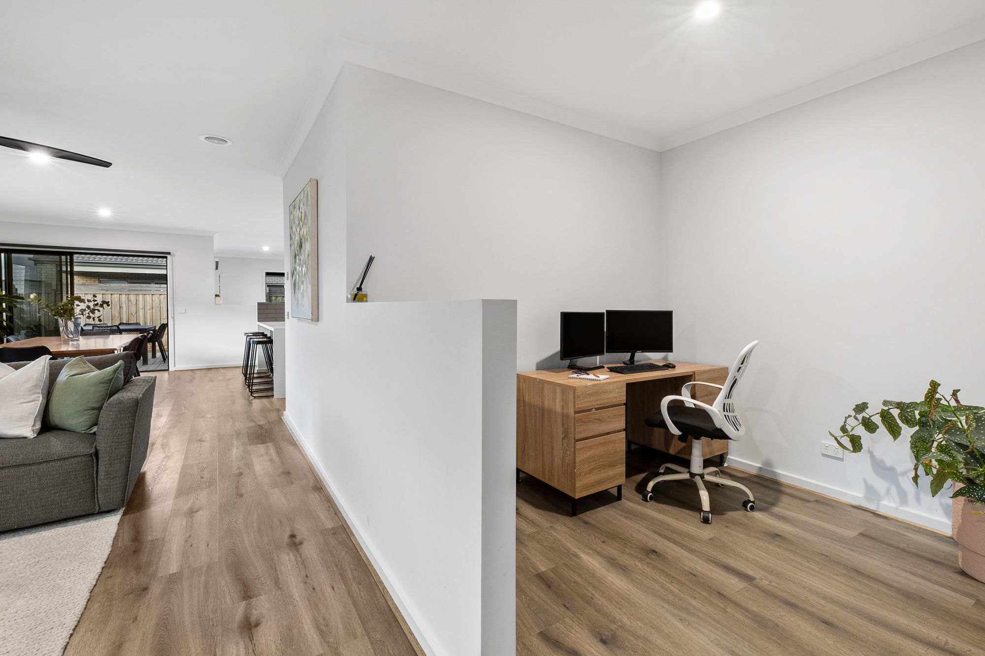 Study nook: Semi-secluded with feature pony wall, downlights, stylish timber laminate flooring