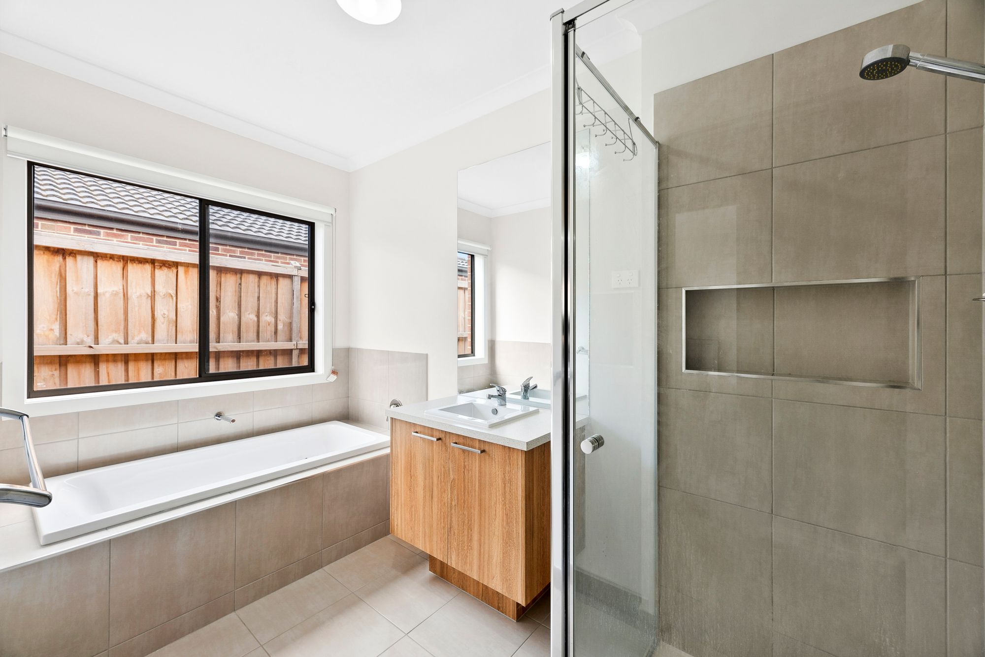 Main Bathroom – Shower with niche, raised bath overlooked by a window with a roller blind, single sink with a 20mm stone benchtop vanity and storage, chrome fittings and mirror splashback.