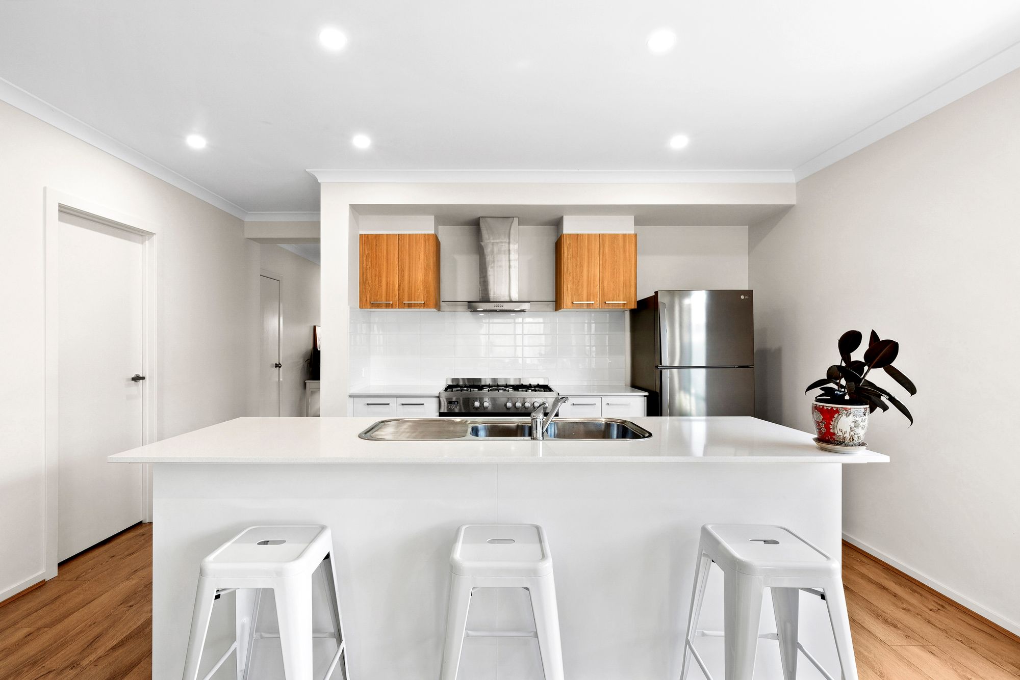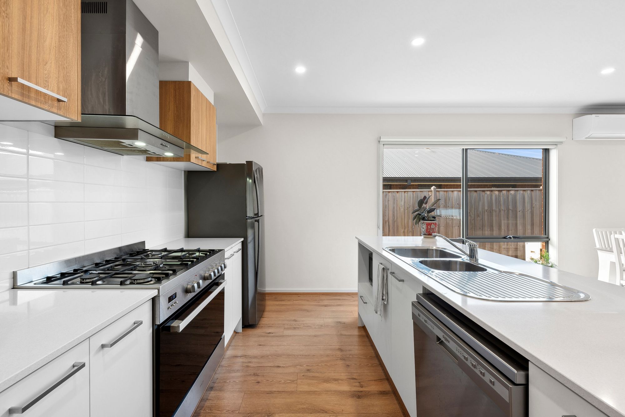 Kitchen – Open plan kitchen complete with a double basin sink set on 20mm stone benchtops with a breakfast bar overhang to the island bench. Rear kitchen bench space featuring a 900mm oven, stovetop and overhead range hood. Walk-in pantry with built-in shelving, fridge cavity, ducted heating and split-system cooling.