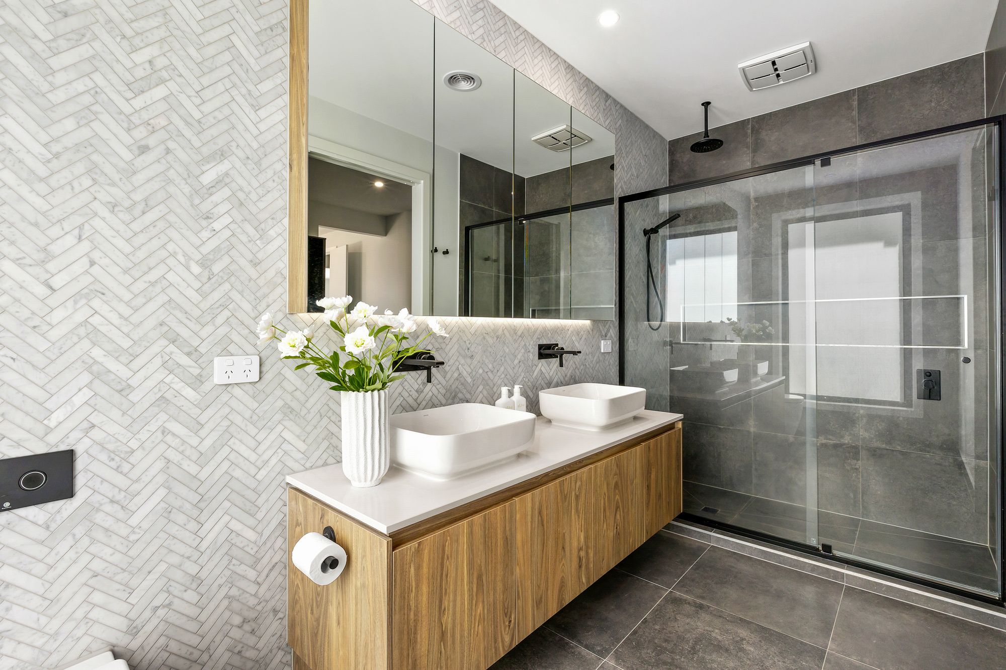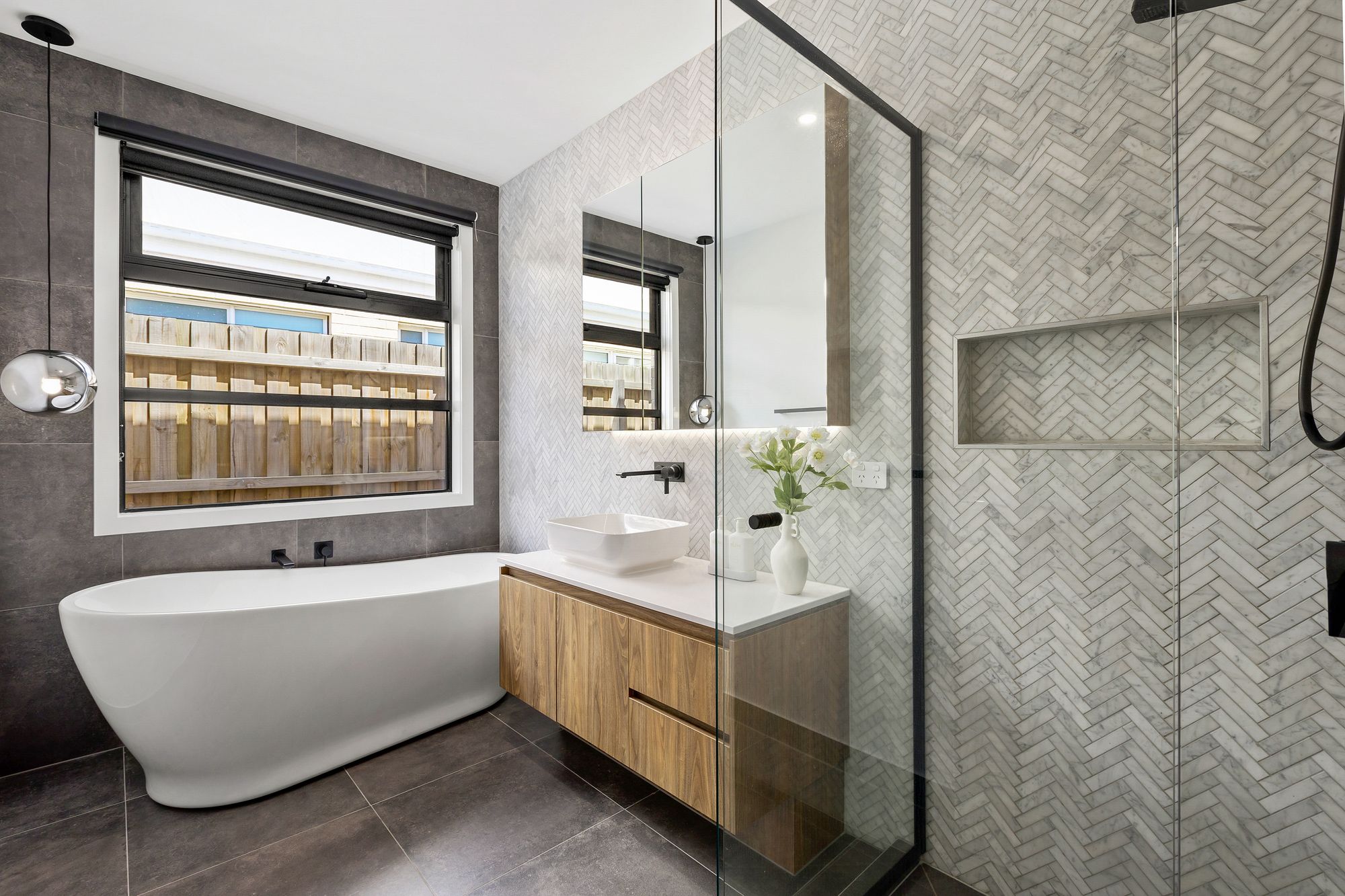 Additional Bathroom: Effortlessly servicing the household and the three bedrooms surrounding, the secondary bathroom homes a single basin on a 20mm stone benchtop vanity, floor to ceiling tiles, semi-frameless shower with handheld/wall-mounted showerhead and niche, high-end freestanding bath and wide double glazed windows with remote blinds. A separate powder room can be found adjacent to the secondary bathroom.