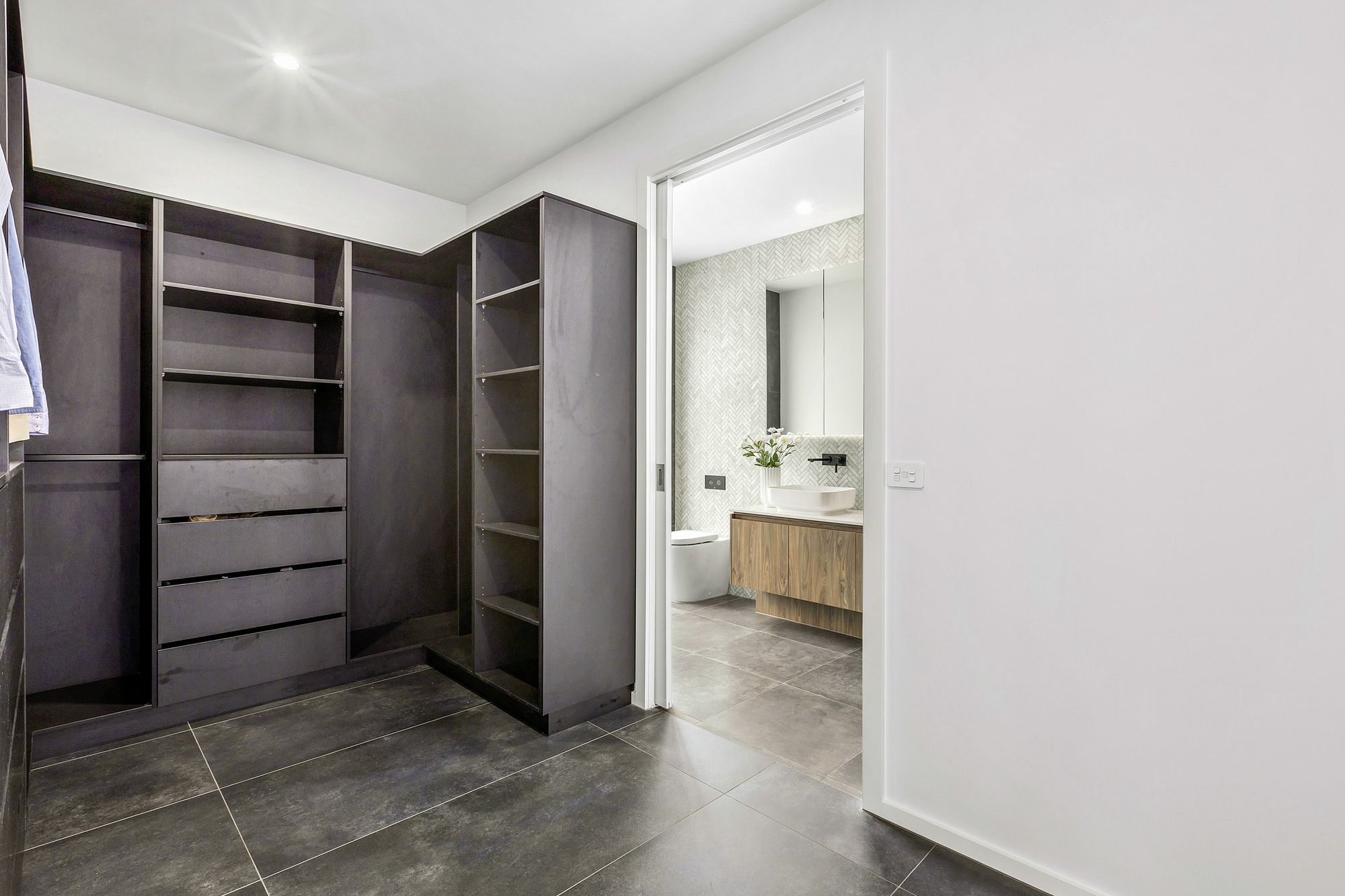 Master Suite: Generously sized and situated at the front of the home, the master suite showcases the epitome of upscale living and comfort with an impressive walk-in robe and relaxing ensuite. Embrace a wealth of relaxation with a private deck with east facing aspects, opened onto by large double glazed stacking sliding doors. Complete with sheer curtains, blockout curtains, downlights and ducted heating creating a cosy space year-round. The walk-in robe establishes a new standard with a high-end fit out, comprising of additional shelving, drawers, full length storage and hanging rails. The gorgeous ensuite consists of a plentiful amount of storage coupled with a 20mm stone benchtop vanity and dual basins, floor to ceiling porcelain tiles, mirrored cabinetry with undermount strip lighting. Wall to wall shower with floor to ceiling tiles and niche, rainfall showerhead as well as handheld/wall mounted showerhead. Natural lighting supplied from the substantial, east facing, double glazed and frosted window.