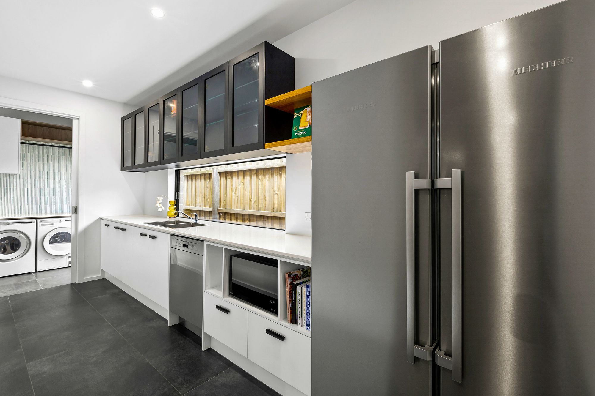 Kitchen: 20mm stone benchtops to the front and rear with an expansive island with waterfall. High end cabinetry including pot drawers and overhead storage. This luxury kitchen features high end upgrades including Smeg appliances, double oven, induction cook top, warming drawer, feature splashback, strip lighting, built-in pullout bin and more. The butlers pantry compliments the main kitchen space with high end cabinetry, additional 20mm stone benchtops, large fridge cavity, dual basin undermount sink, feature highlight window with an East facing outlook as well as direct access to the luxurious laundry. 2740mm tall ceilings with square set cornices, downlights, ducted heating and split-system cooling.