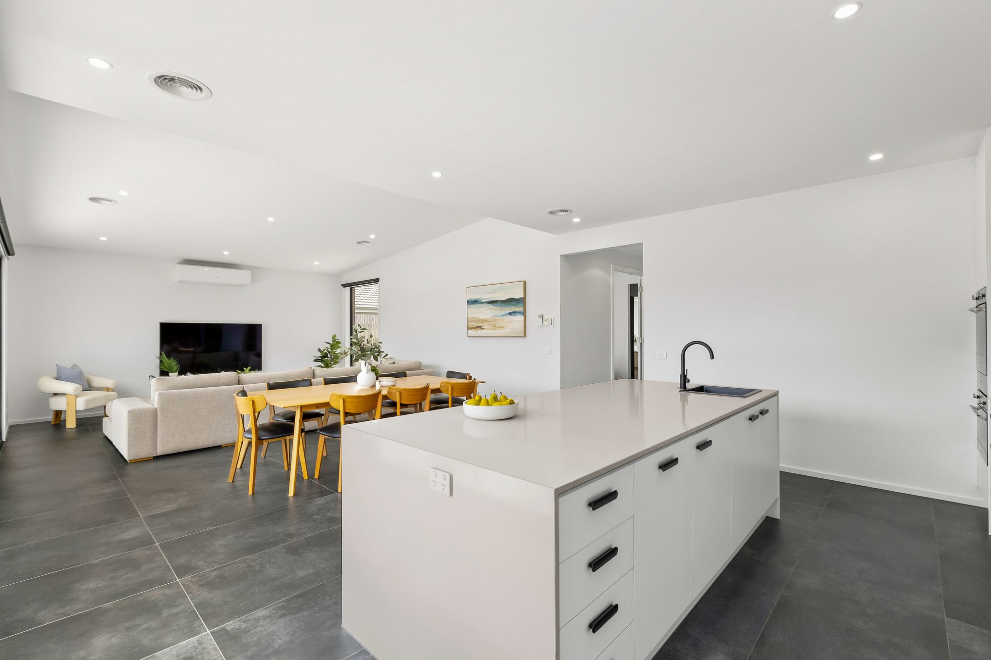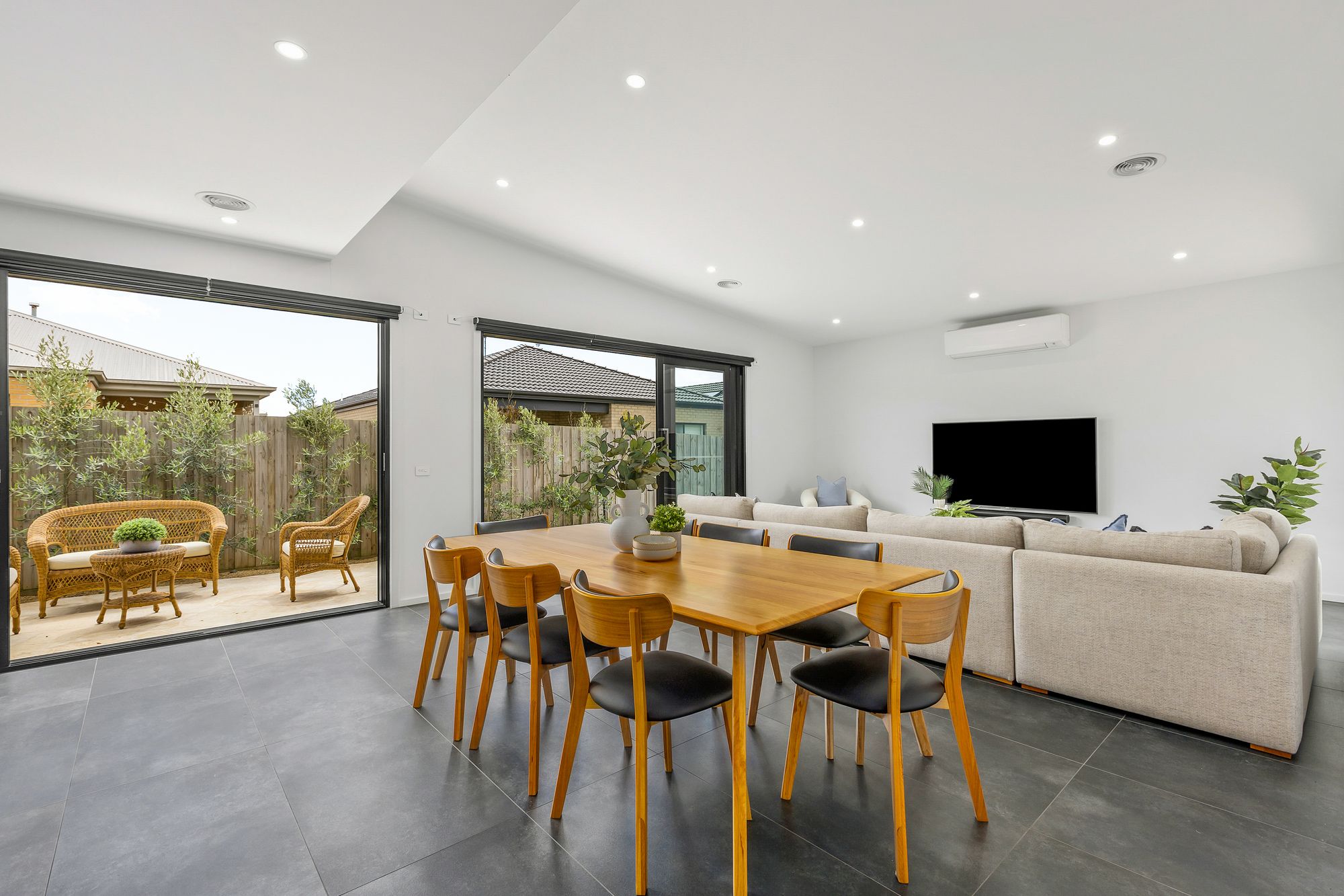 Open Plan Living/Dining: A plethora of natural light projects into the main living space from two stacking sliding doors leading to the chic rear yard and manicured gardens, complete with double glazing motorised blinds and North-facing aspects. Skillion ceilings with square set cornices, downlights, ducted heating and split-system cooling.