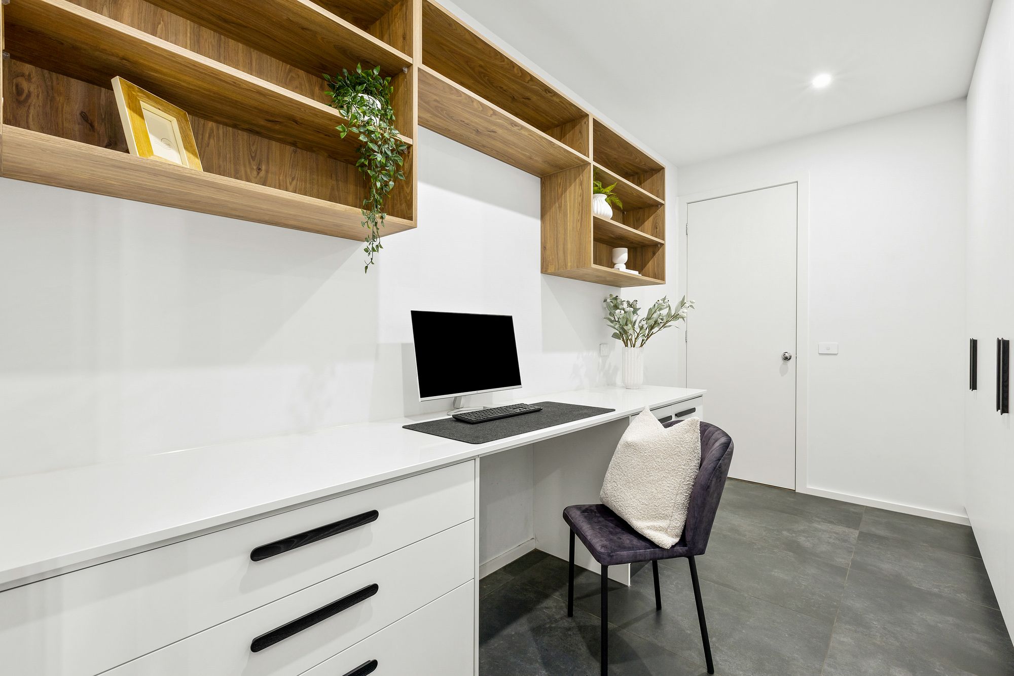 Additional Living Space: Spacious and offers various styles of living, entertainment and privacy dependant on it’s use. The additional living space provides a comfortable and spacious abode with ducted heating, downlights, square set cornices, 100% wool carpet with premium underlay, South-facing double glazed windows with blockout blinds and sheer curtains. An additional study provides space for the home office or workspace with built in cabinetry, 20mm stone benchtop as well as overhead shelving. The space also holds a large amount of storage with cupboards lining the rear wall and lockable filing cabinet.