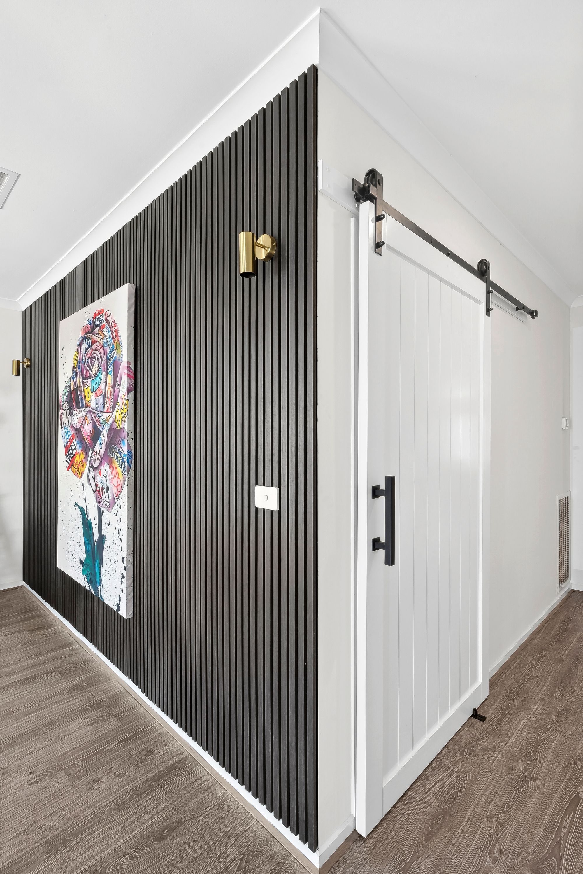 Master: Custom barn door, window with roller blinds, carpet, downlights, ducted heating and evaporative cooling, walk in robe.