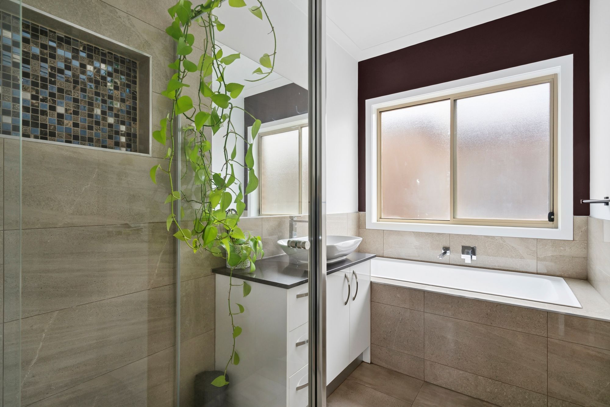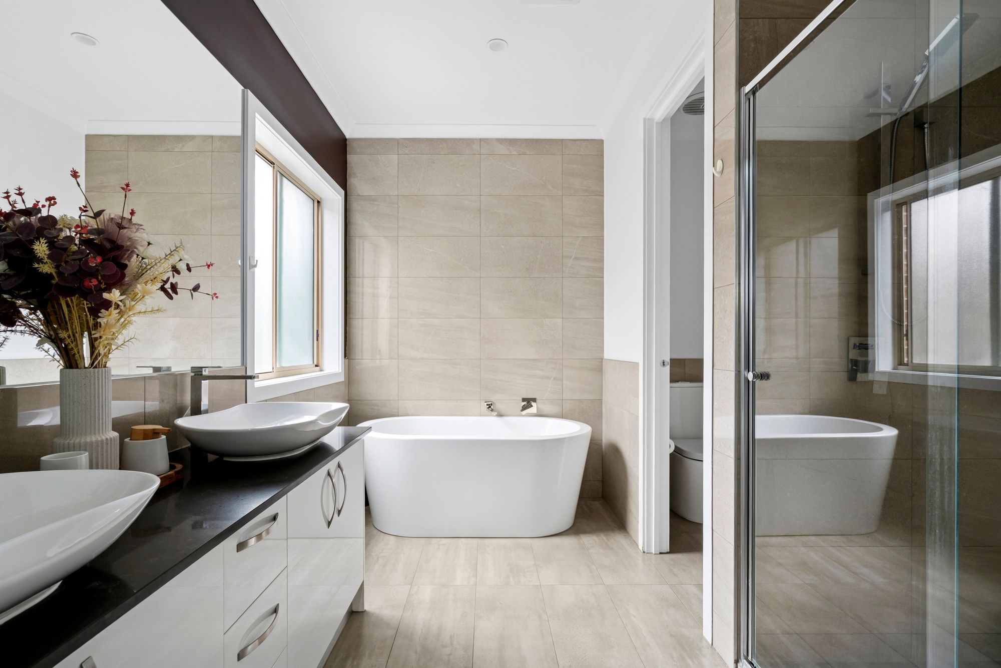 Master Suite: Generously sized and situated at the rear of the home, it showcases a side by side walk-through robe to the elegant ensuite. Complete with North-facing windows with sheer curtains and blockout blinds, a East-facing highlight window with blockout blinds, downlights, feature lighting, ducted heating and refrigerative cooling, creating a comfortable space year-round. The gorgeous ensuite consists of a wide shower with a handheld and ceiling-mounted showerhead, dual basins on a large 20mm stone benchtop vanity with tiled and mirrored splashbacks, high-end freestanding bath, private toilet, frosted window with blockout blinds.