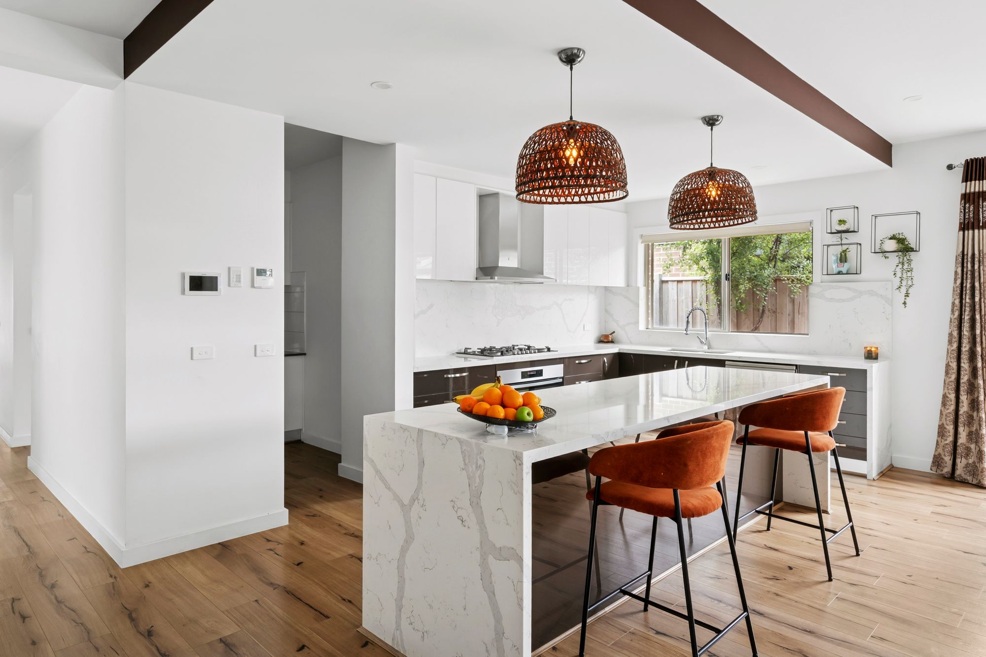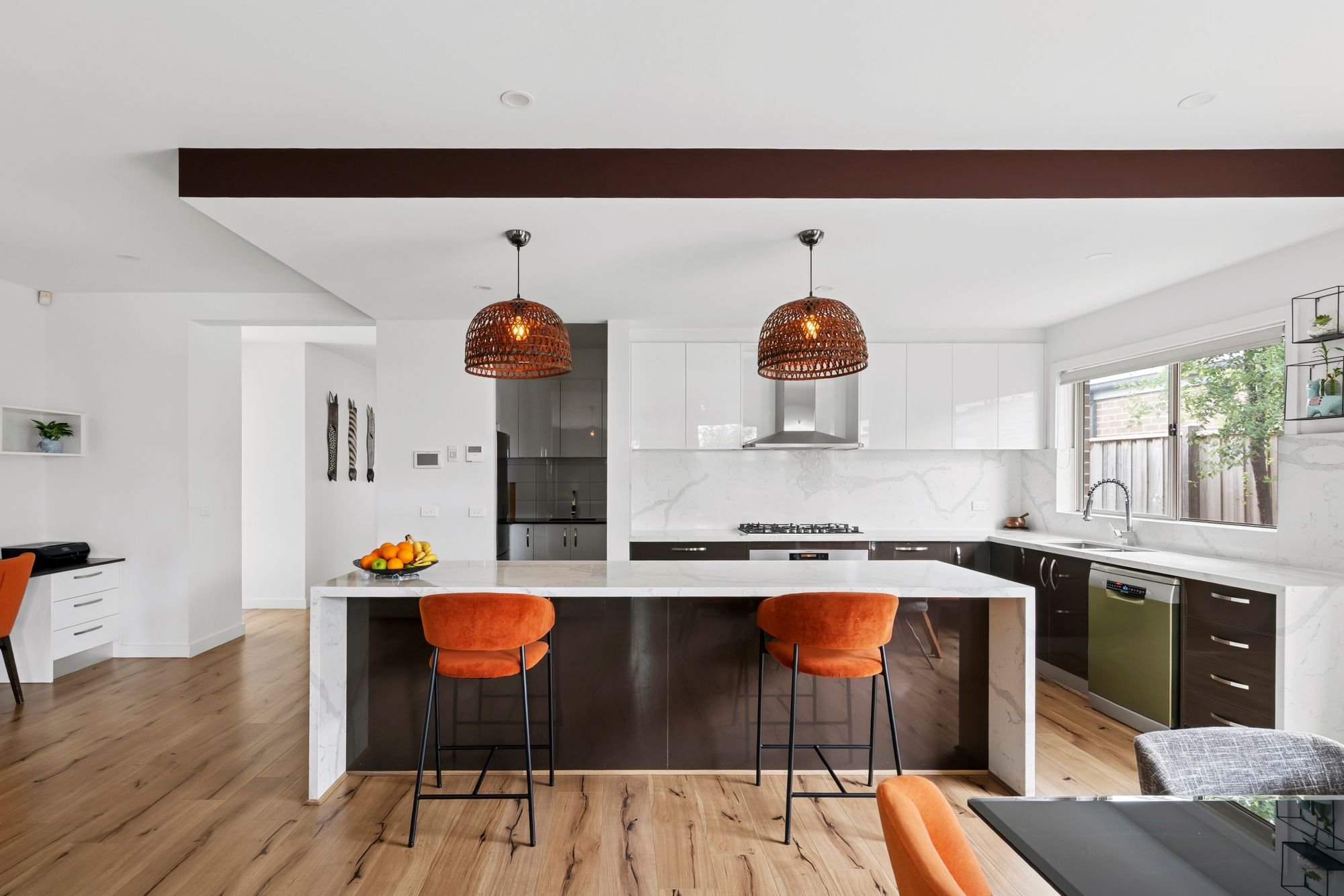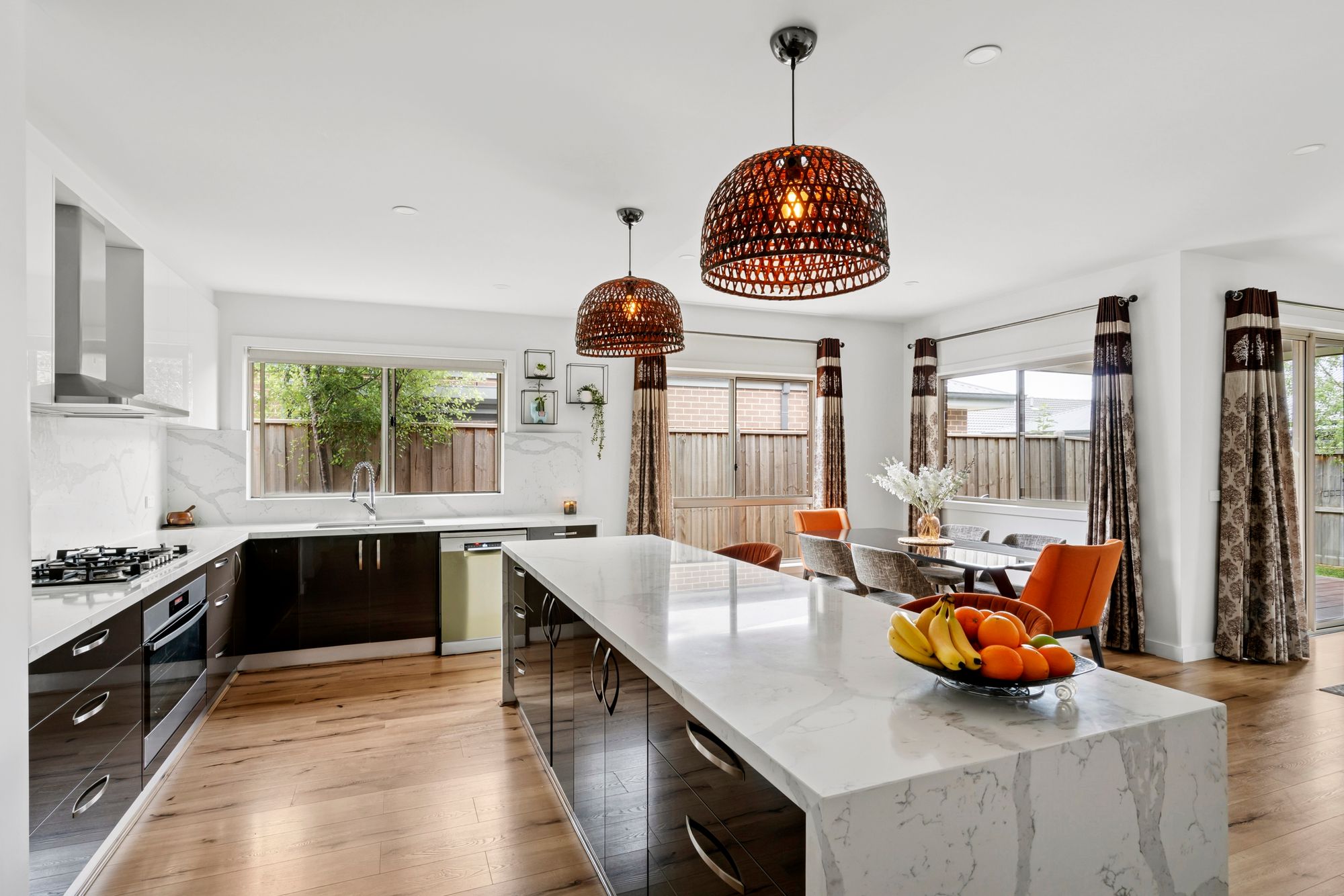Kitchen: Butler’s pantry with a plethora of storage options, additional sink and large fridge cavity with overhead storage. Generously sized kitchen benchtops with 40mm marble, waterfall and breakfast bar overhang to the island bench, undermounted dual basin sink, pot drawers and overhead storage, dishwasher as well as semi-integrated 900mm oven and stovetop, downlights, ducted heating and refrigerative cooling.