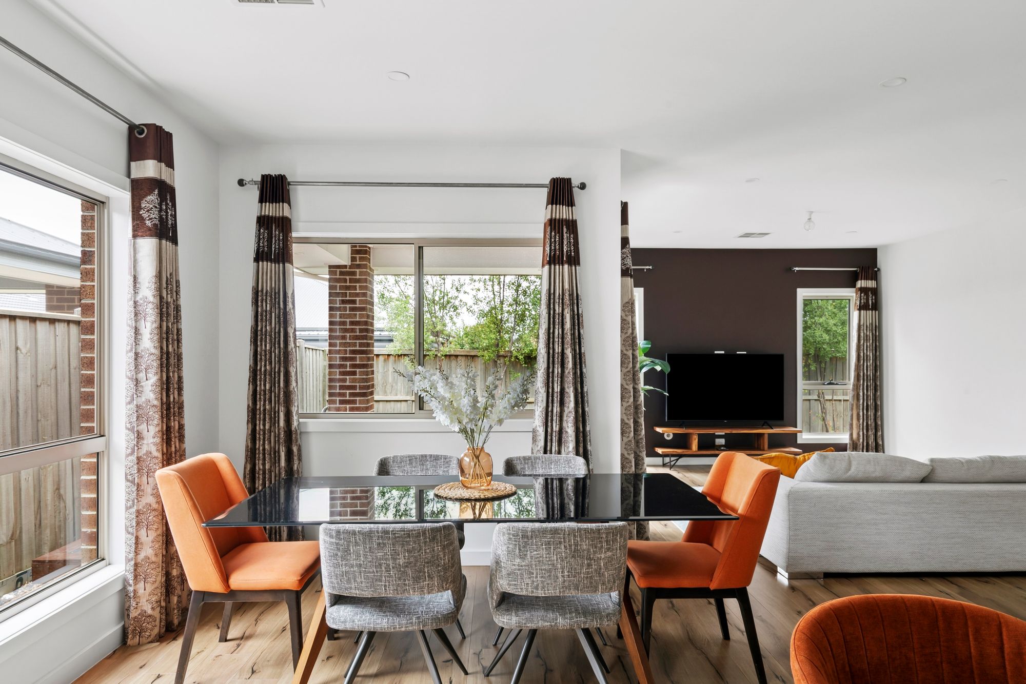Open Plan Living/Dining: Ample natural light from the surrounding South and West facing double glazed windows and stacking glass sliding doors leading out onto the decked and undercover outdoor entertainment area as well as grassed rear yard. Downlights, ducted heating and refrigerative cooling.