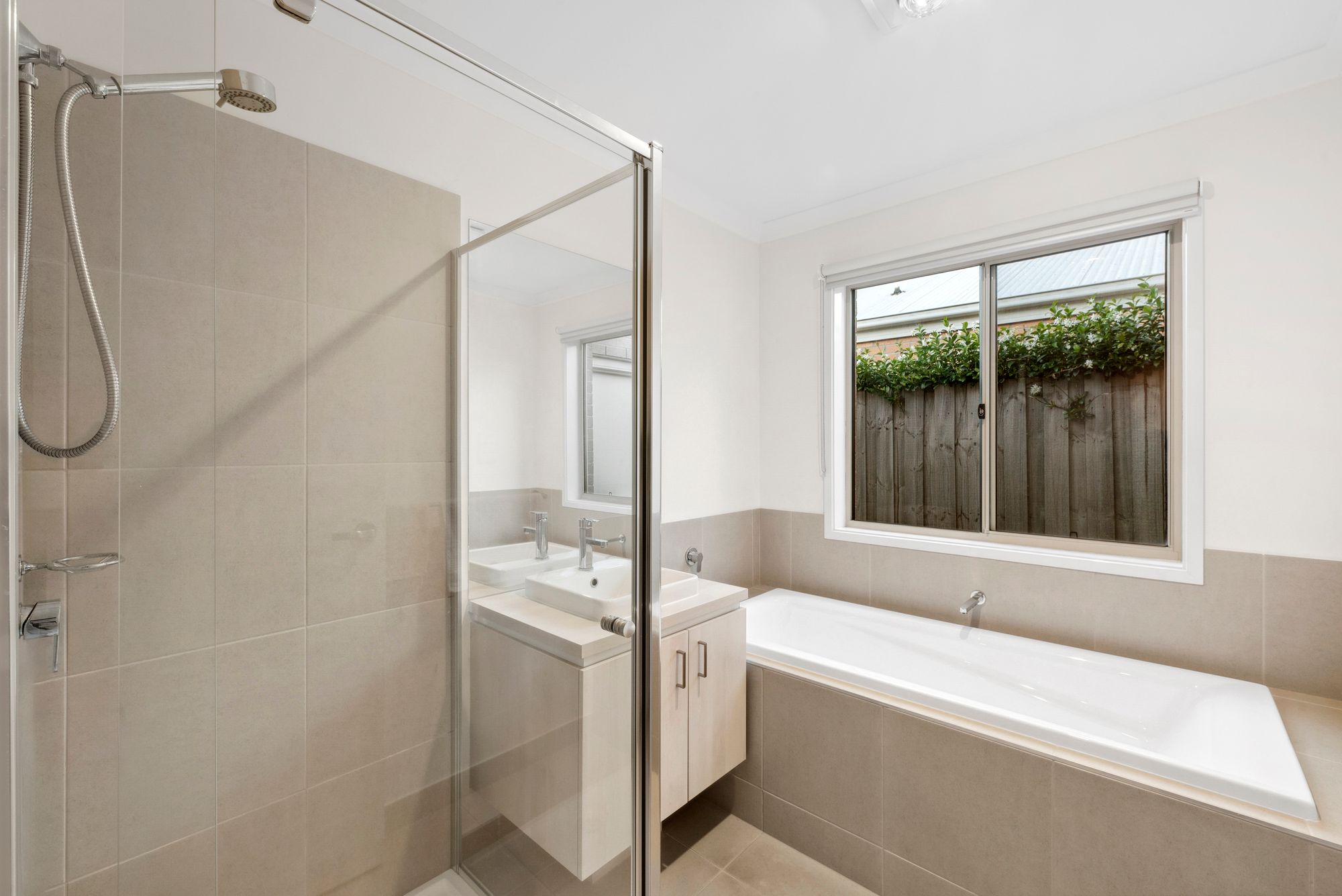 Main Bathroom: Semi frameless shower, bath, tiled, single basin and vanity with mirror splash back, high ceilings, downlights,, roller blinds