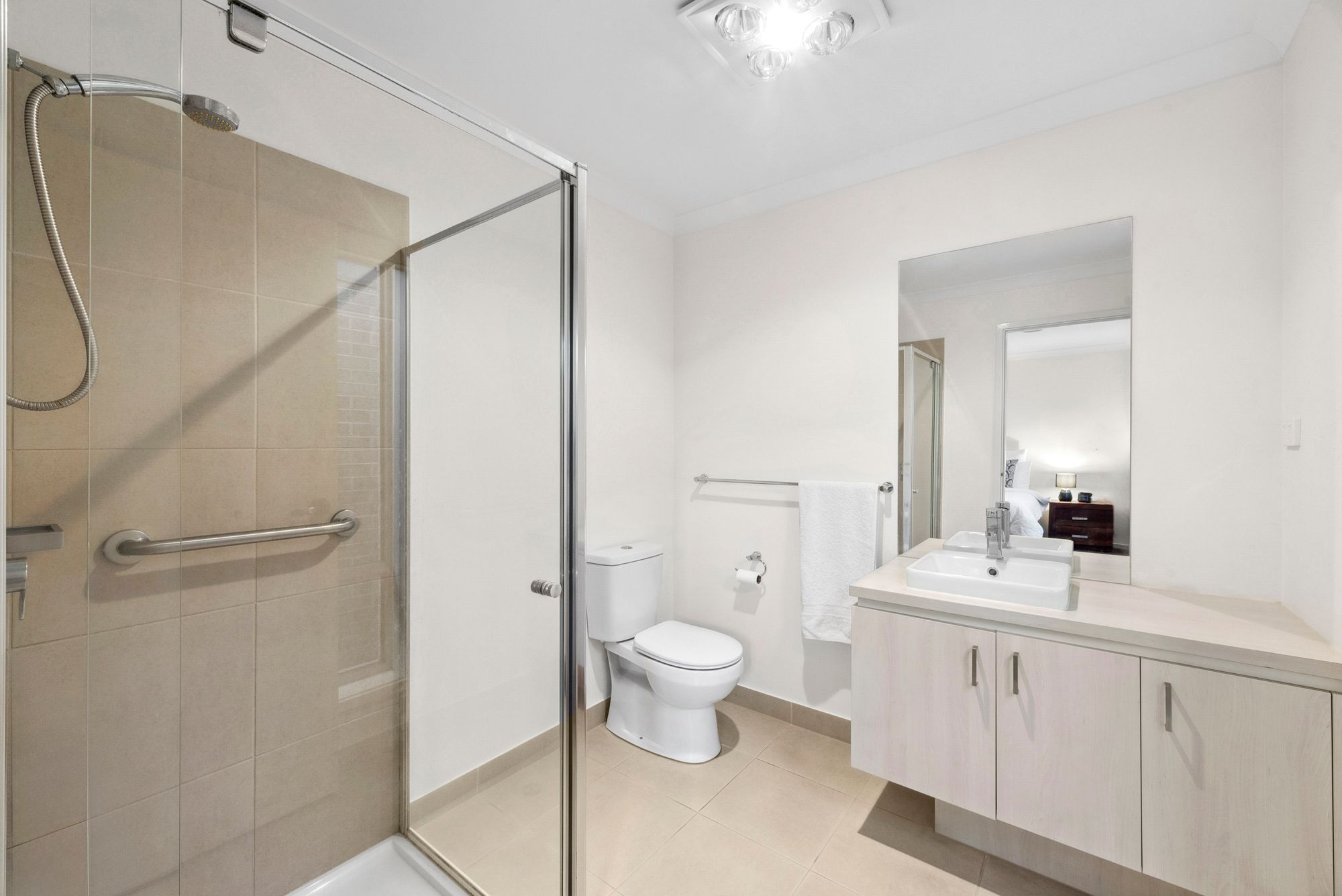 Master Suite: Carpet flooring, ducted heating, high ceilings, downlights, roller blinds, walk in robe ensuite; semi-frameless shower, stone benchtop, large mirror splash back, single vanity with ample storage, chrome fittings, toilet.