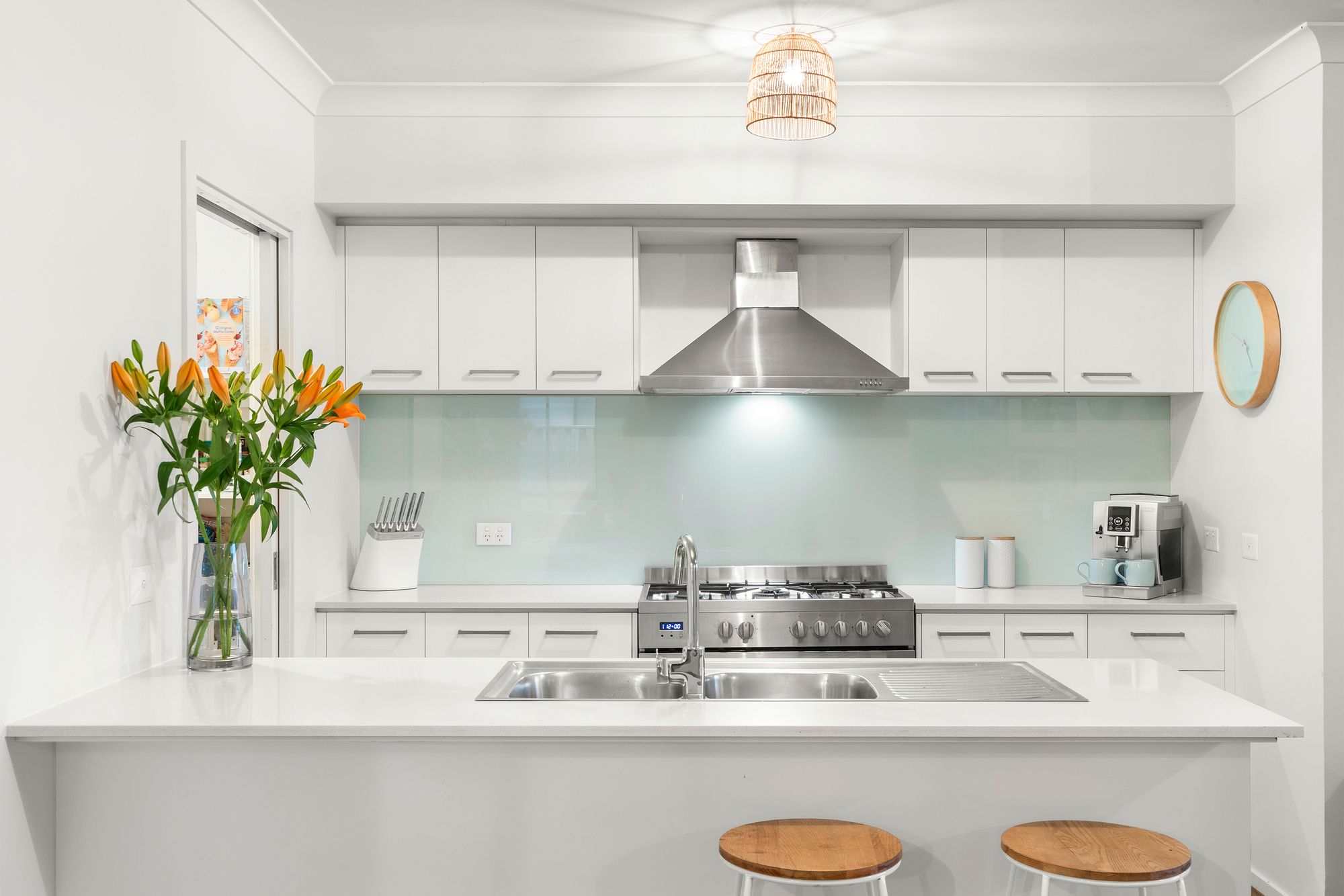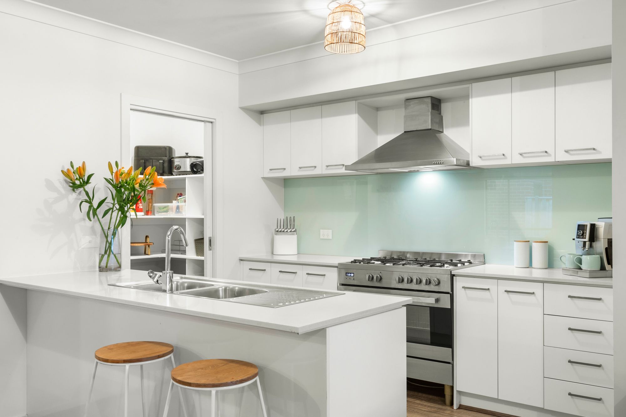 Kitchen- 20mm Caesarstone benchtops, double sink, chrome fittings, overhead cabinetry, ample storage, 900mm gas cooktop, oven & range hood, glass splash back, spacious walk in pantry