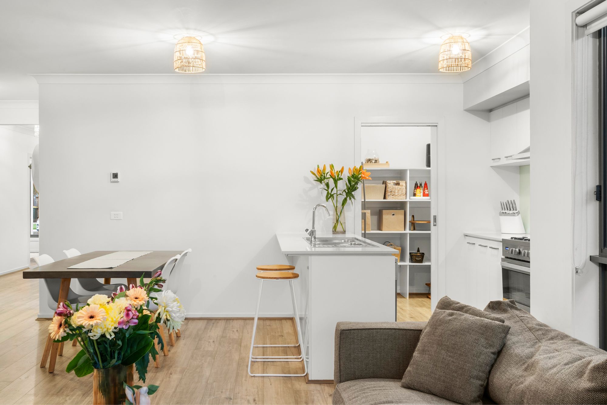 Living- Open plan adjoining living/dining/kitchen, timber laminate flooring, ducted heating, split system cooling, sliding doors open from open living/dining outdoor alfresco creating a natural indoor-outdoor flow, windows with roller blinds and curtains