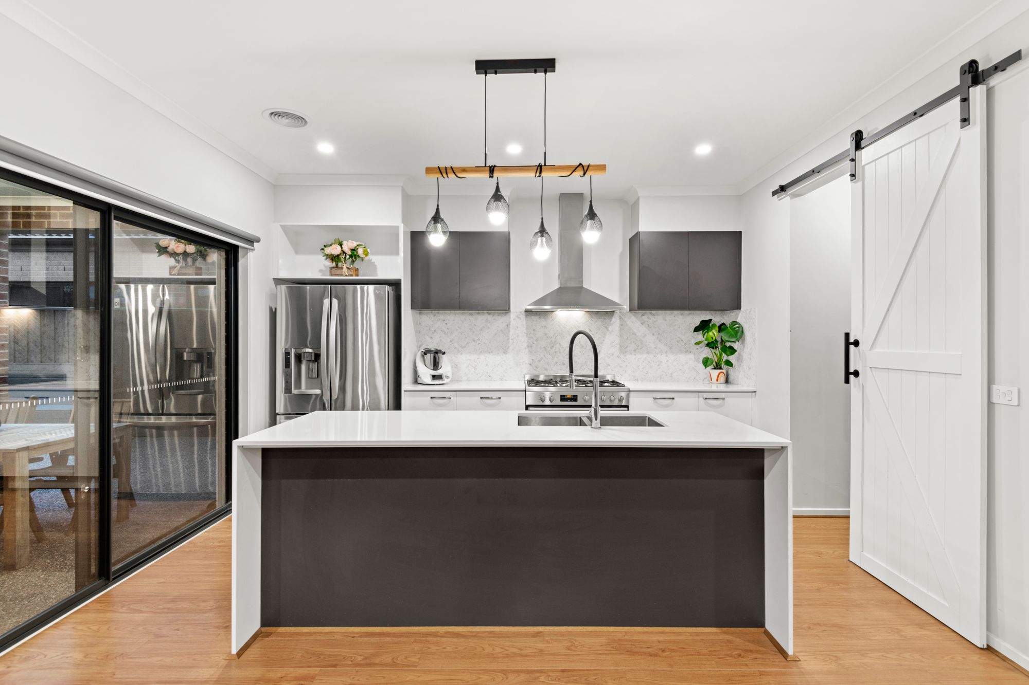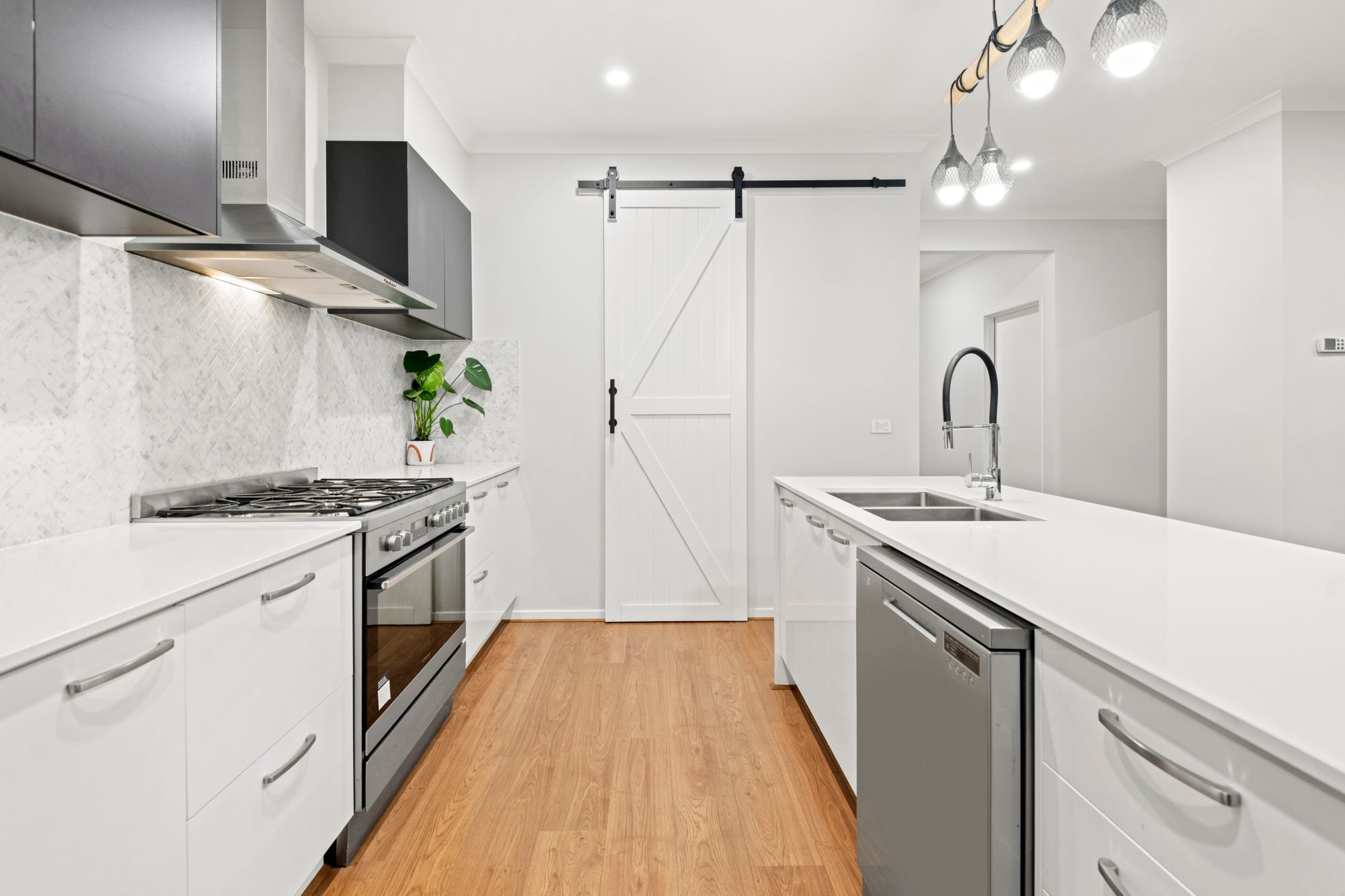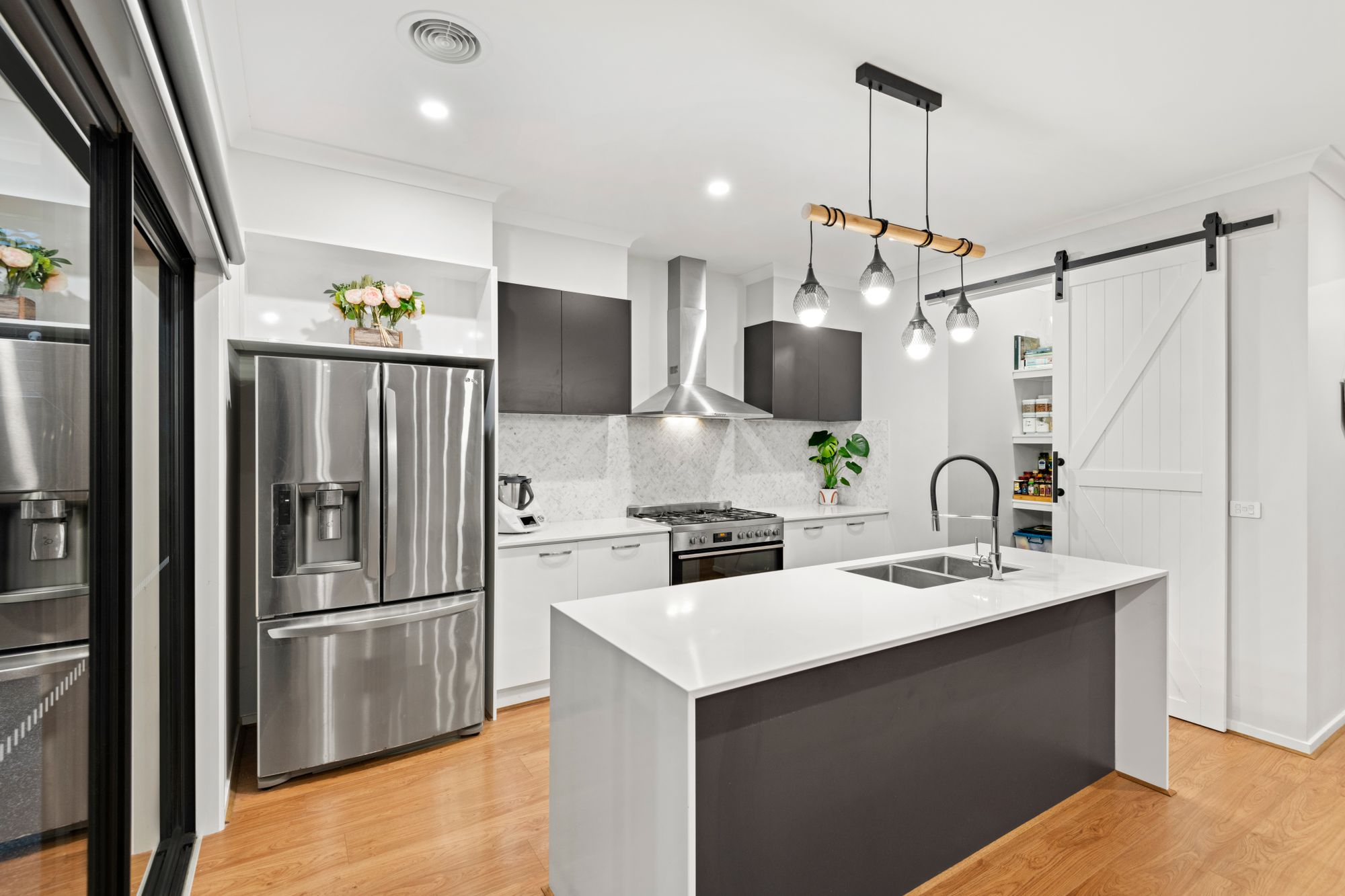 Kitchen: stone benchtops, herringbone tile splashback, sensational feature pendant lighting, 900mm appliances, double inset sink with veggie sprayer, overhead cabinetry & soft-close storage drawers, dishwasher, walk in pantry, grand barn door with paneling & matte black fittings, downlights and timber laminate flooring