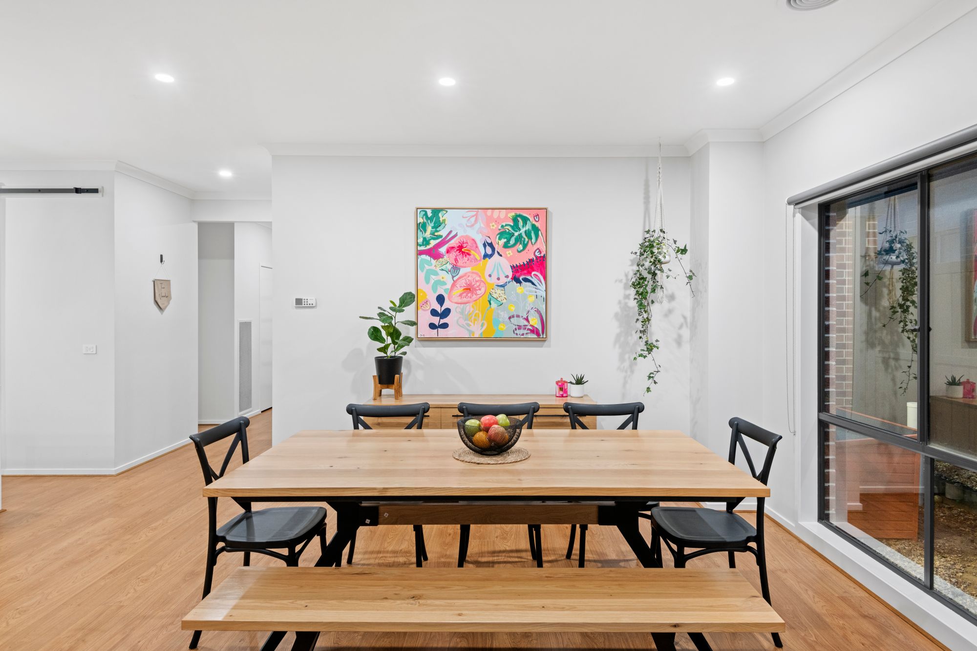 Living: open plan kitchen/living/dining, raised ceilings creating a grand feel, downlights, ducted heating, north-facing windows allowing ample natural sunlight, sliding stacker doors from kitchen & living space to undercover alfresco creating that indoor/outdoor flow, roller blinds, timber laminate flooring