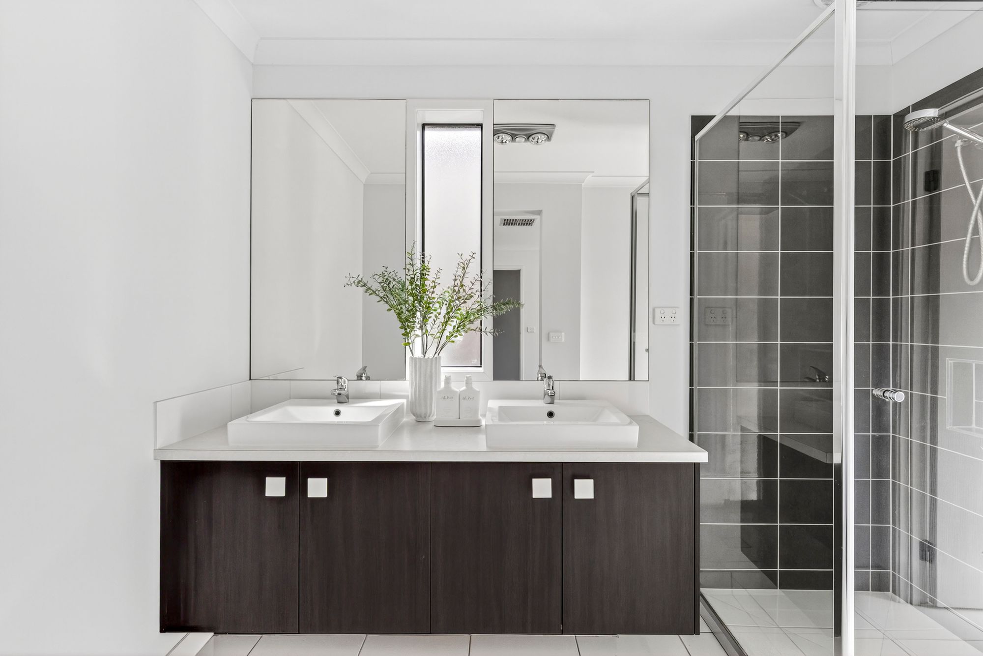 Ensuite: Semi-frameless shower with hand-held showerhead, twin vanity with ample storage and dual mirror splashback, towel rail, private toilet with door