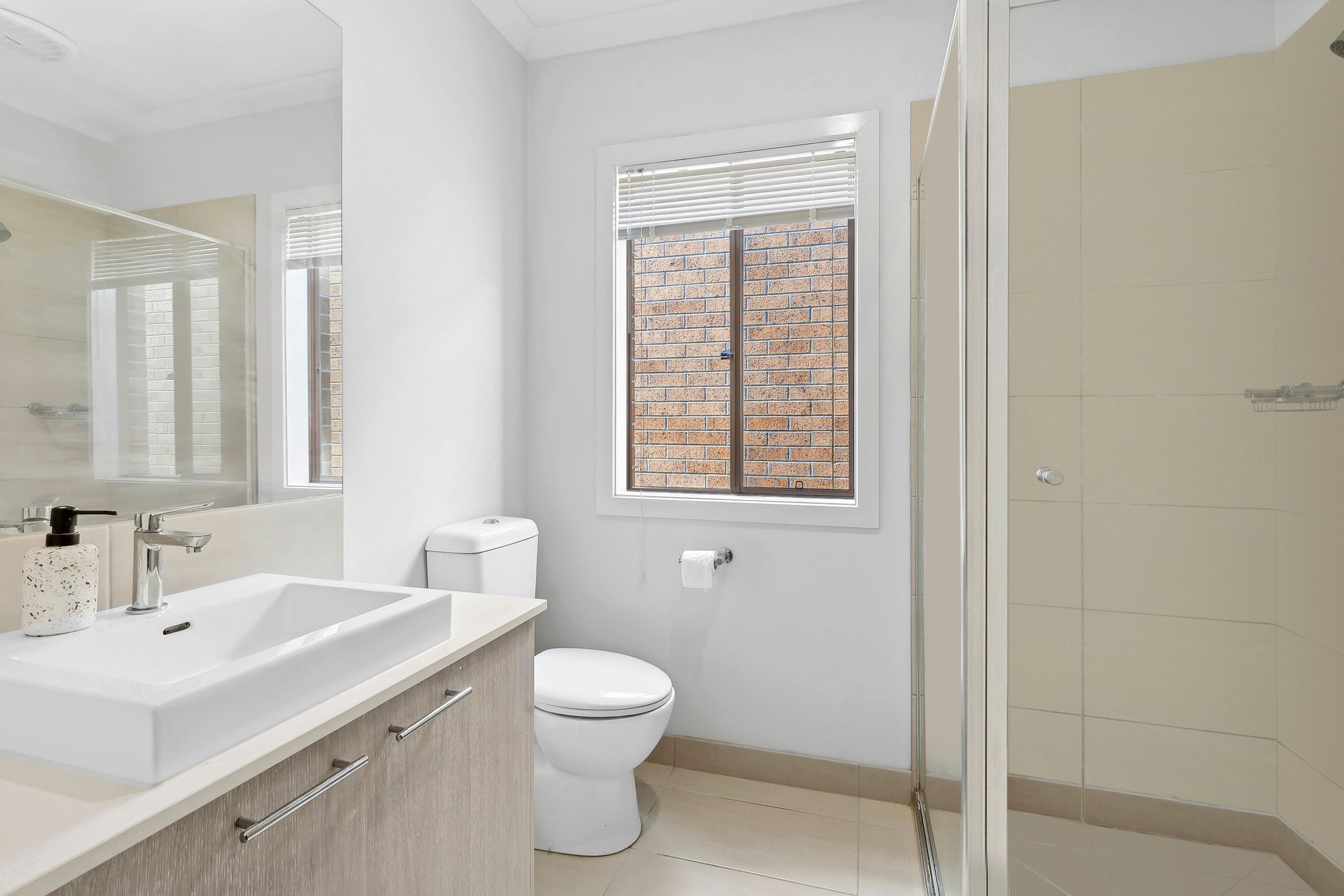 Master Suite: Situated at the front of the home. It showcases a generously sized space, ceiling fan, large feature windows with blockout curtains and ducted heating. The stylish ensuite inhabits a tiled shower, wall-mounted showerhead and chrome fixtures. Single basin on a 20mm stone benchtop vanity with underbench storage, window and toilet.
