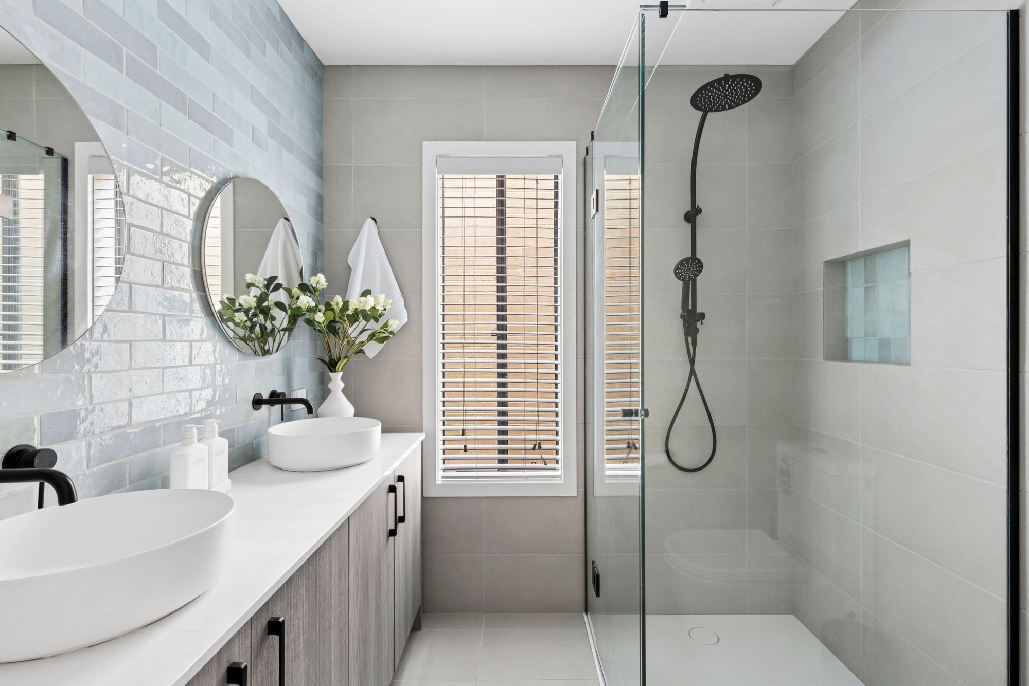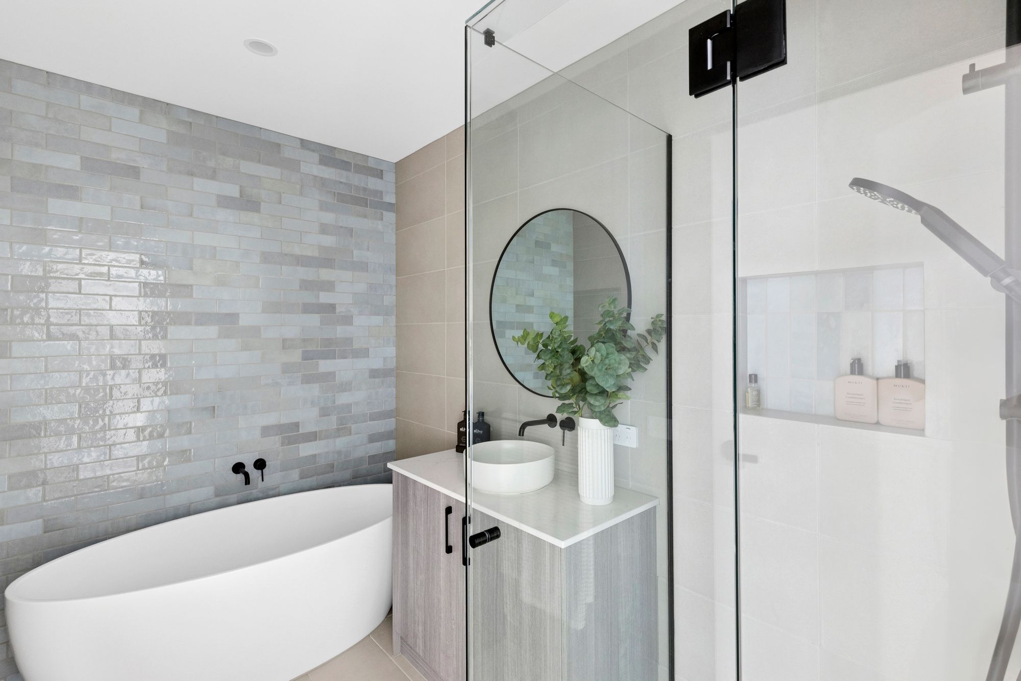 Main Bathroom: Freestanding bath, floor to ceiling tiles, black accents, towel rack, semi-frameless shower with upgraded floor, upgraded waterfall and handheld shower head, shower niche, 20mm stone benchtop, single vanity with ample storage, feature mirror, power points, fan, and separate toilet.