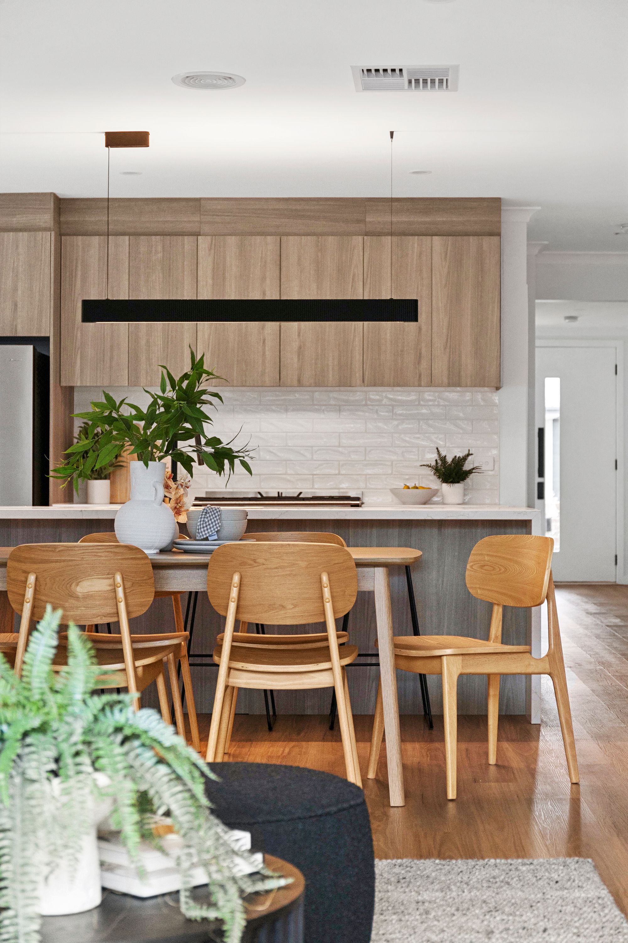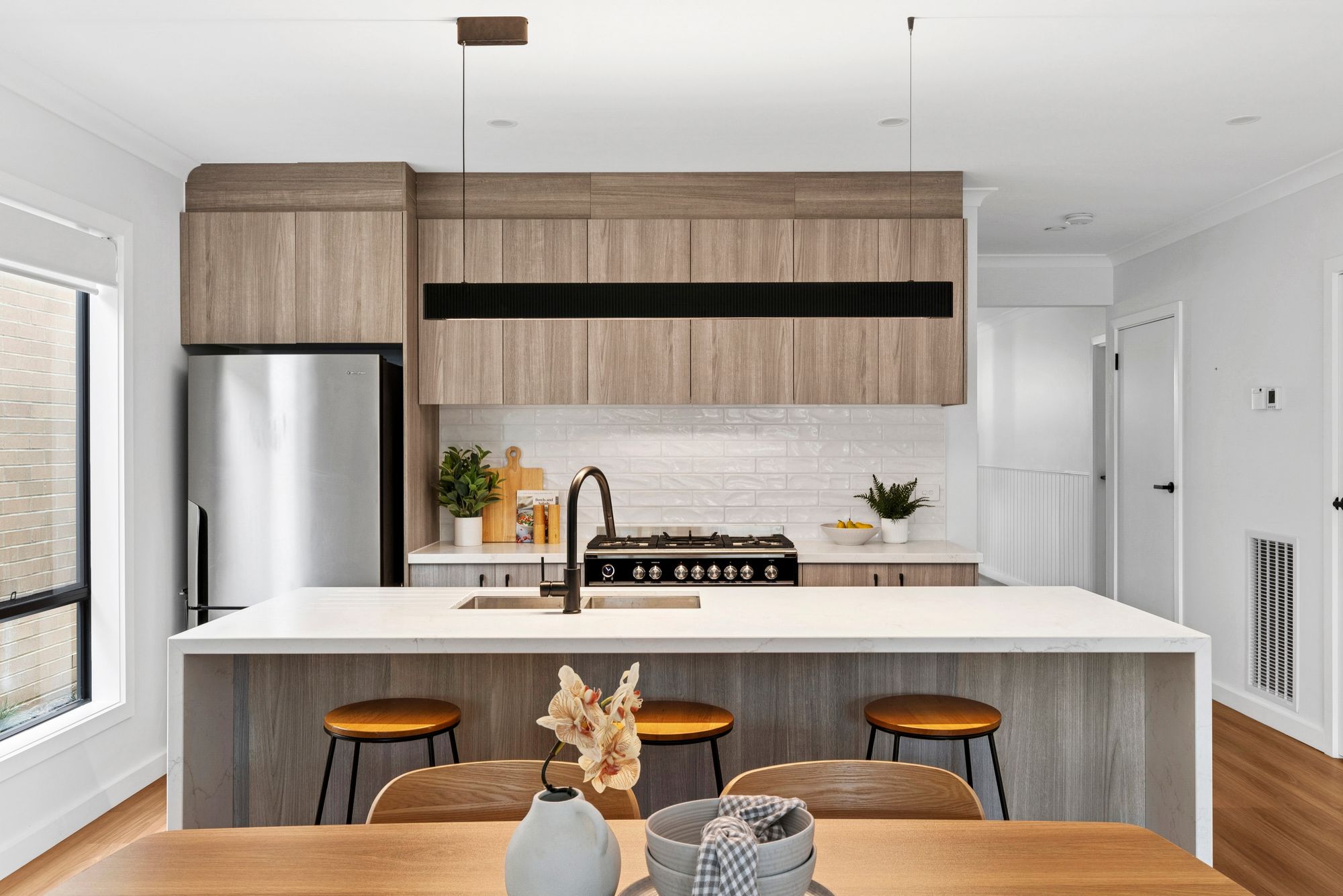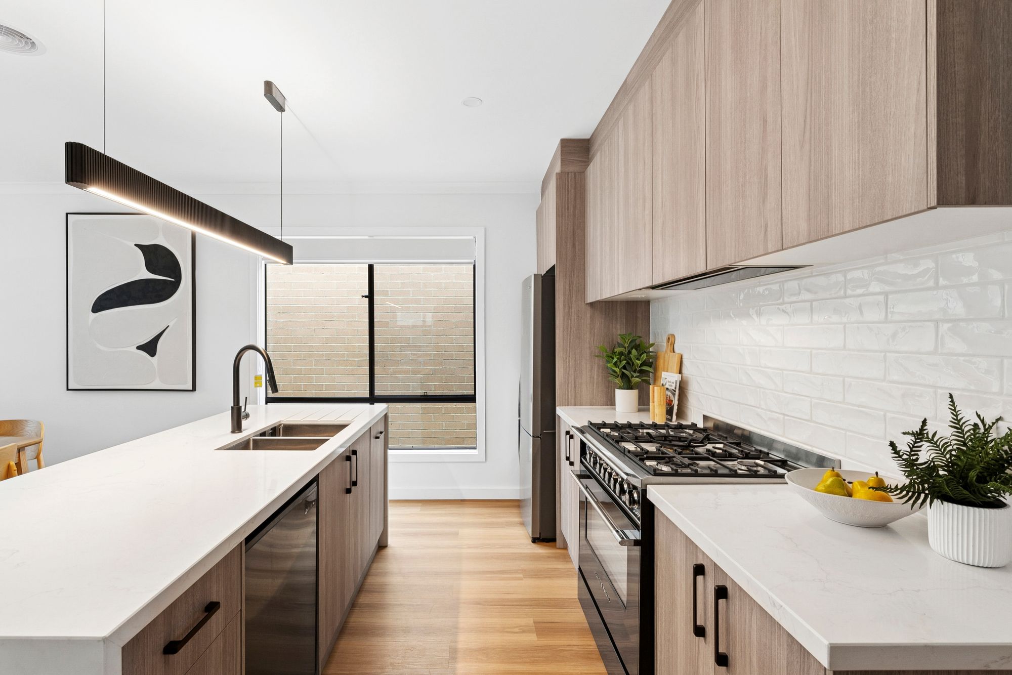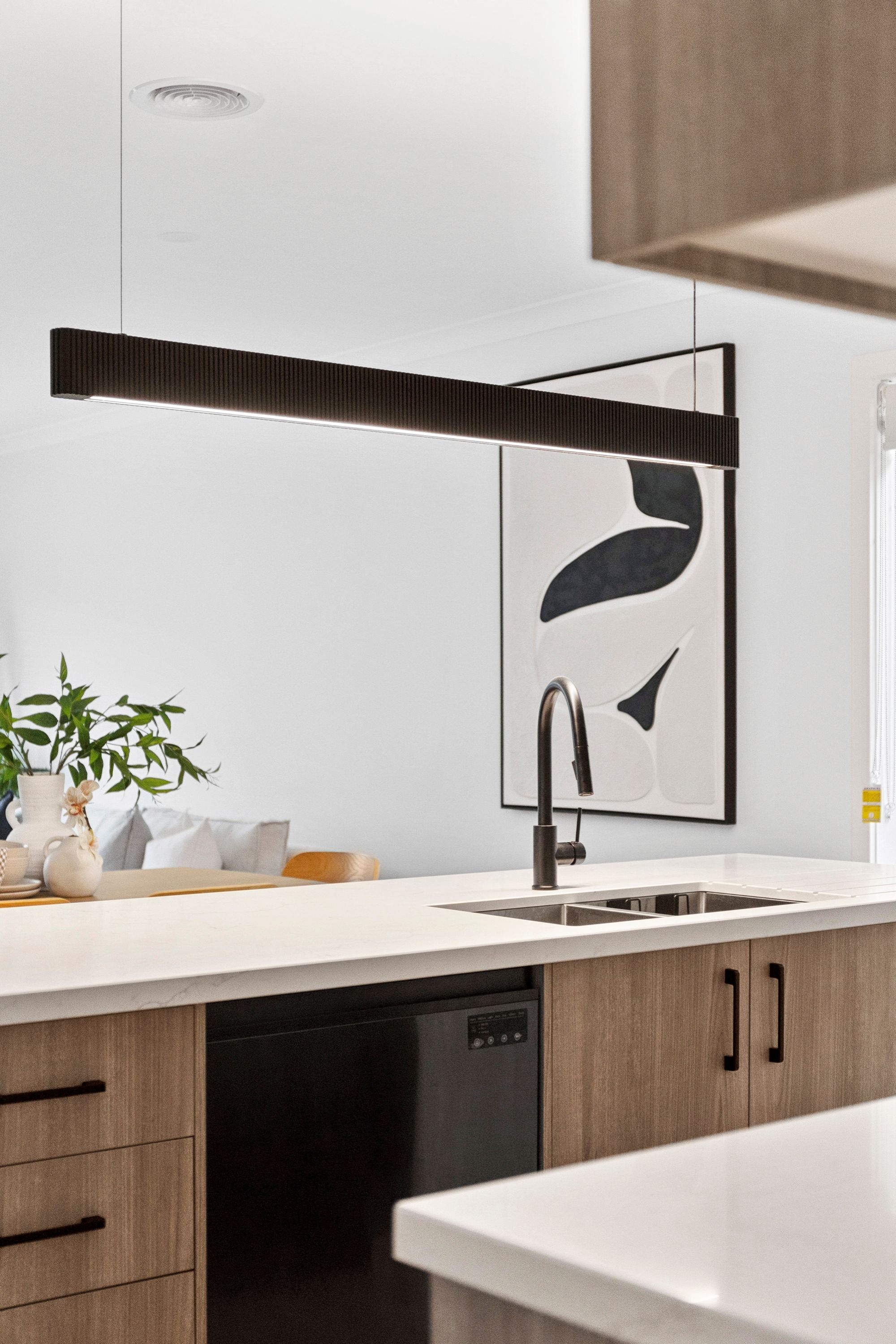 Kitchen: Waterfall 40mm stone island bench with undermount sink, black tapware, overhead cabinets, upgraded Fisher & Paykel 900mm stove and oven, hybrid floorboards, downlights, ducted heating and evaporative cooling, built-in pantry, upgraded feature light bar and tiled backsplash.