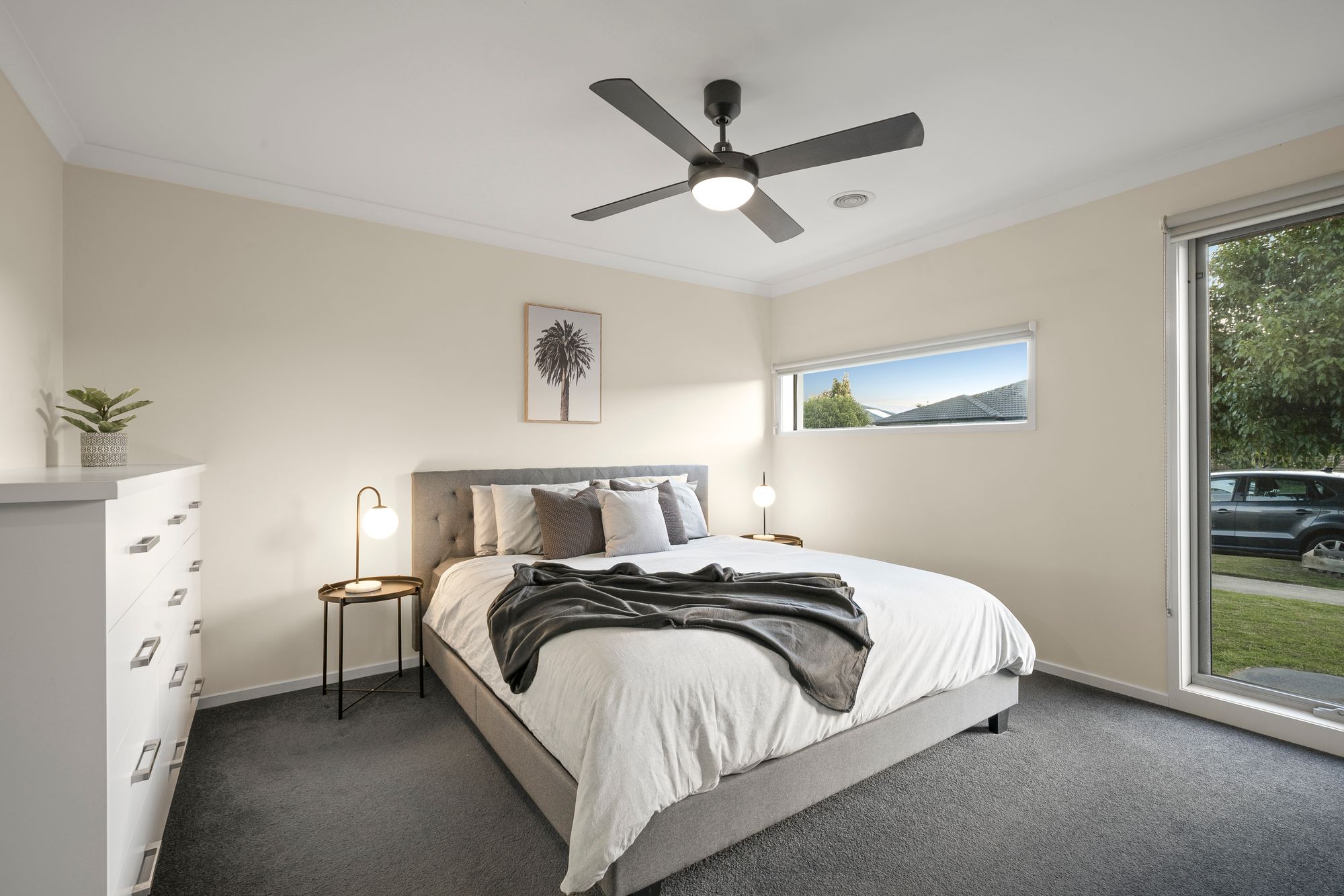 Master Bedroom: Spacious, upgraded carpets, ceiling fan with light, custom built-in chest of drawers, dual window with roller blinds, generous walk-in robe and ducted heating