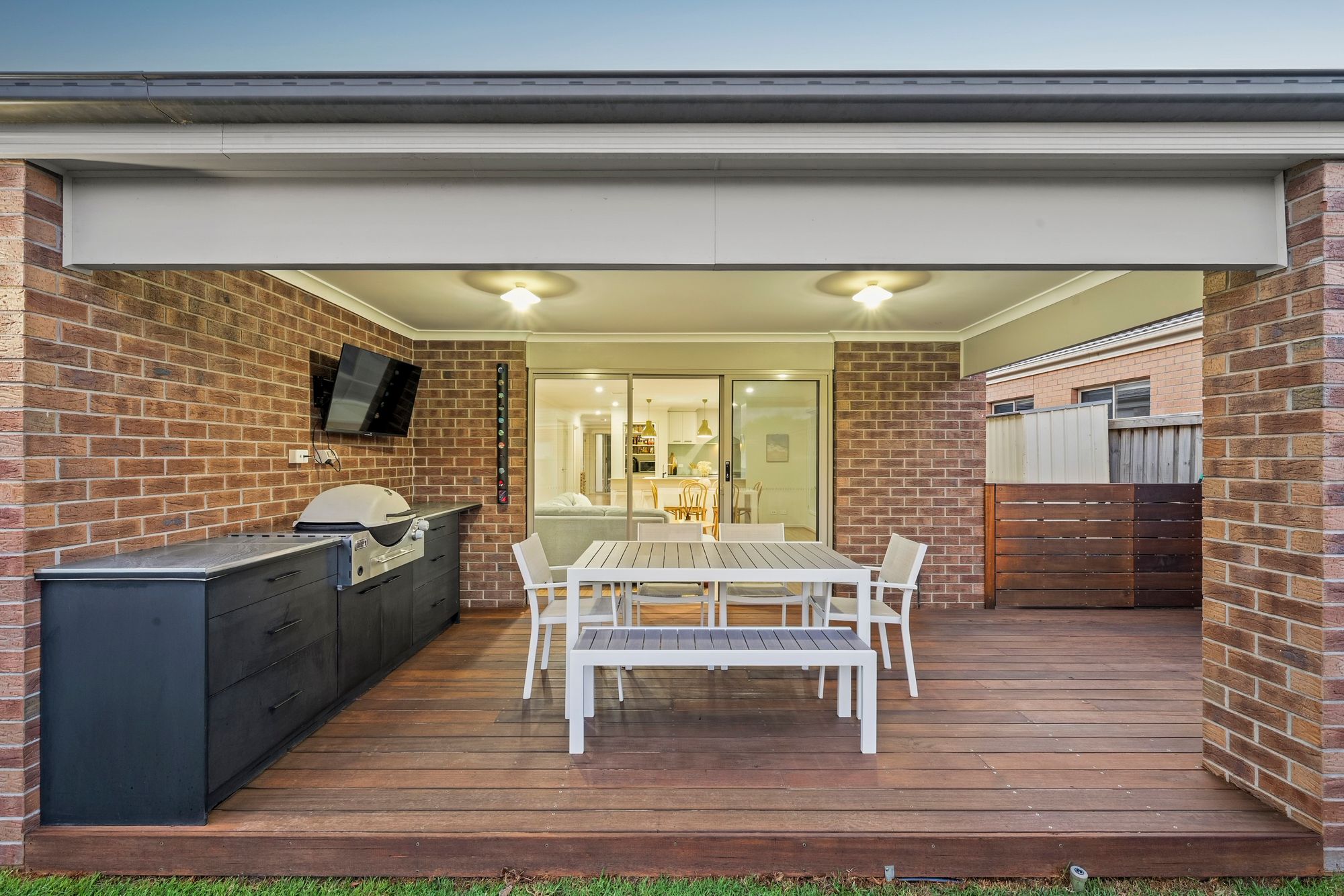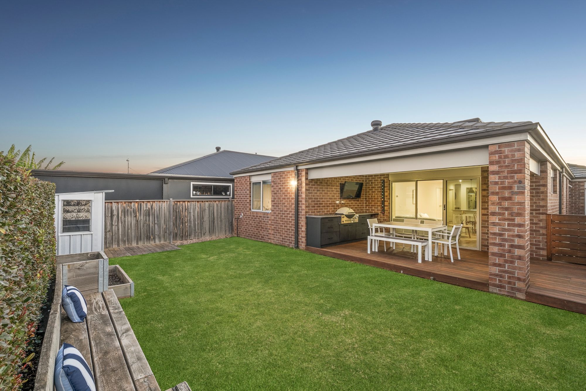 Outdoor: Sliding stacker doors lead to an extended outdoor alfresco, fully installed outdoor kitchen benchtop with barbecue, bar fridge cavity and gas connection, garden bed bench seating, established garden beds, garden shed, and internal and external garage access.