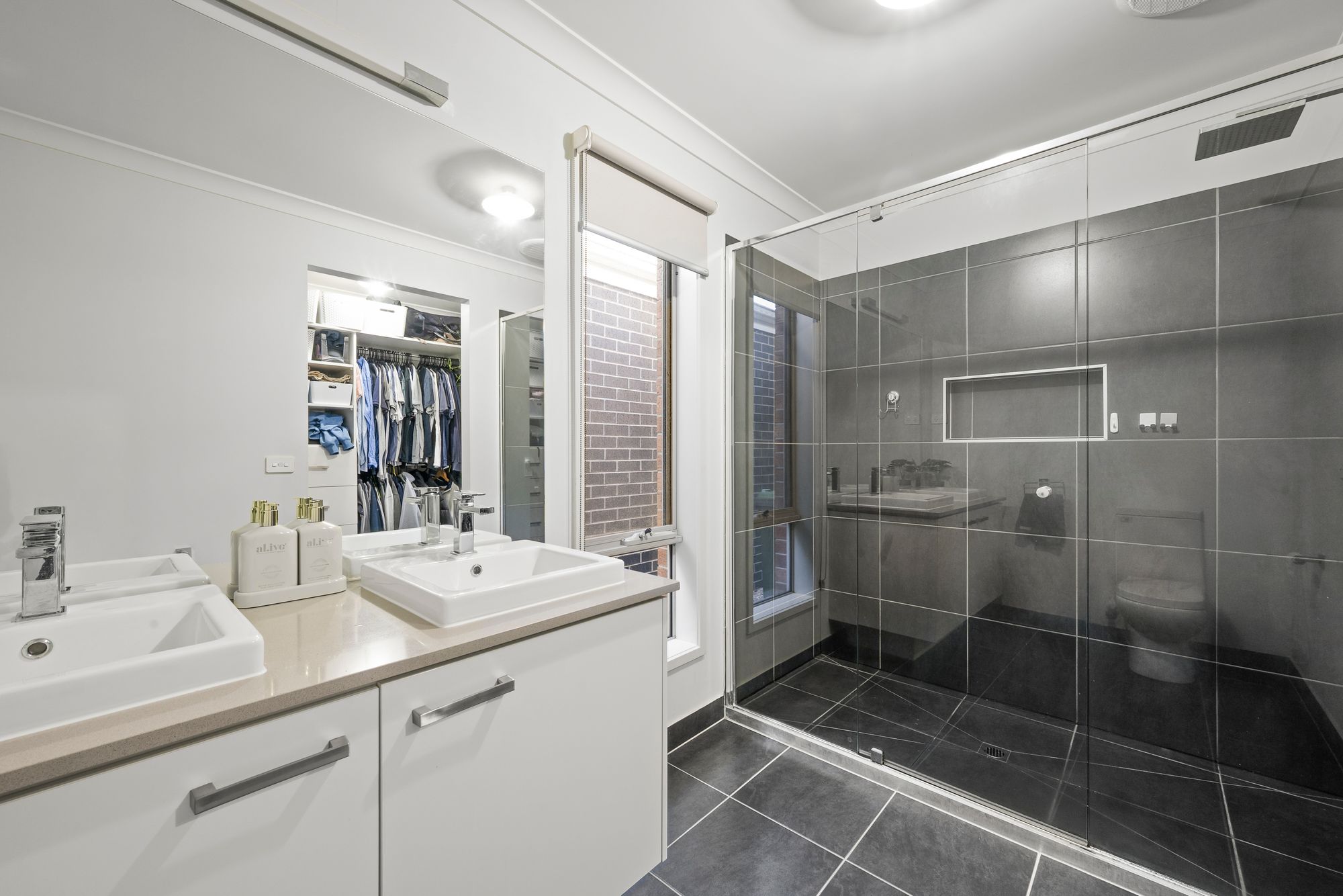 Ensuite: Tiled dual shower with wall-mounted shower head, double vanity with ample storage, high ceilings, stone benchtop, toilet, large mirror, window with roller blind, and shower niche