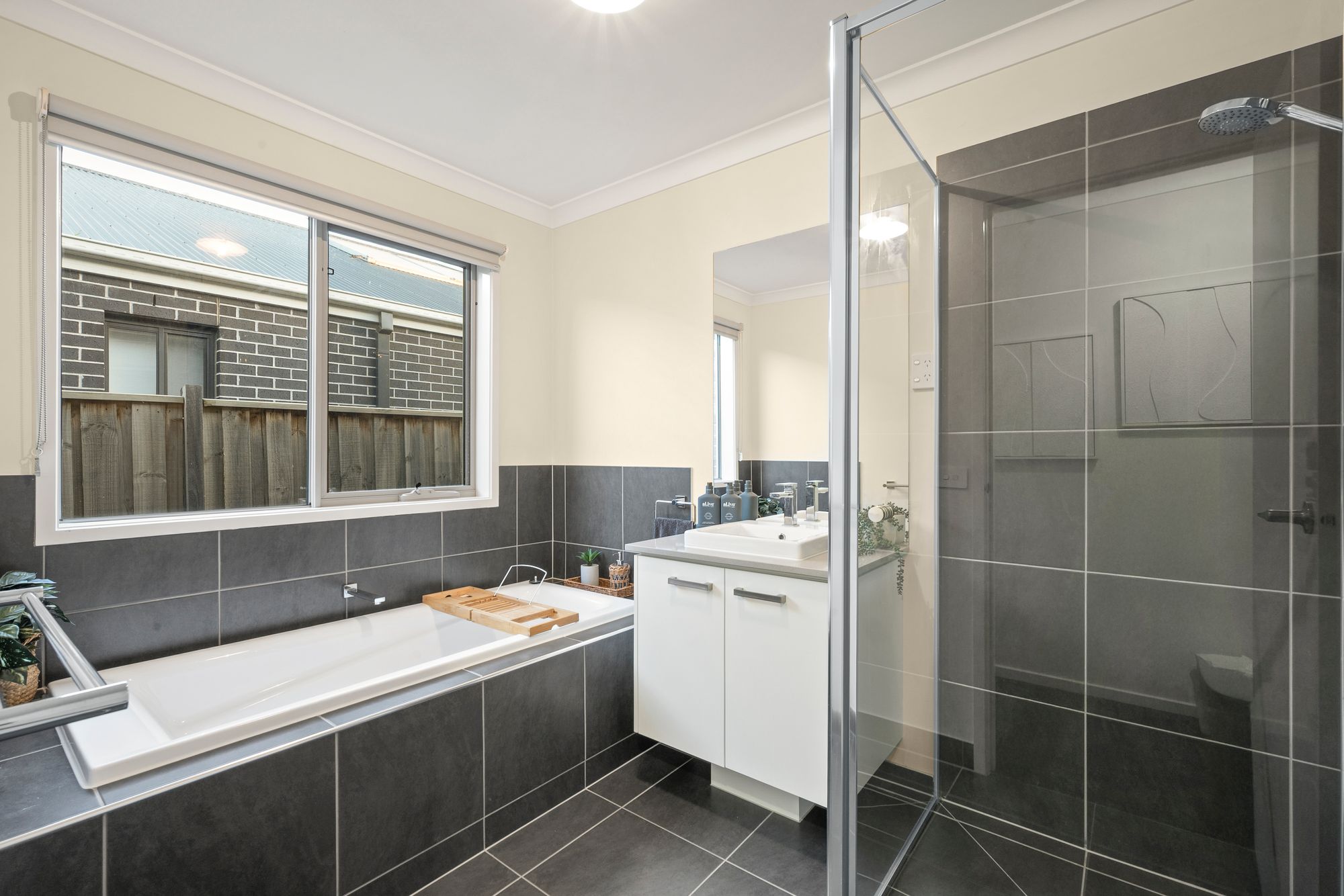 Main Bathroom: Shower with a single vanity, large mirror, separate private toilet, single towel rail, window with roller blind and tiled in bath