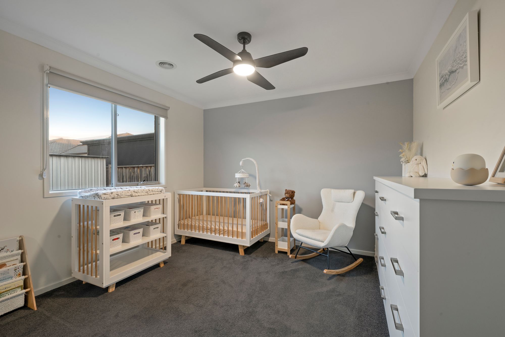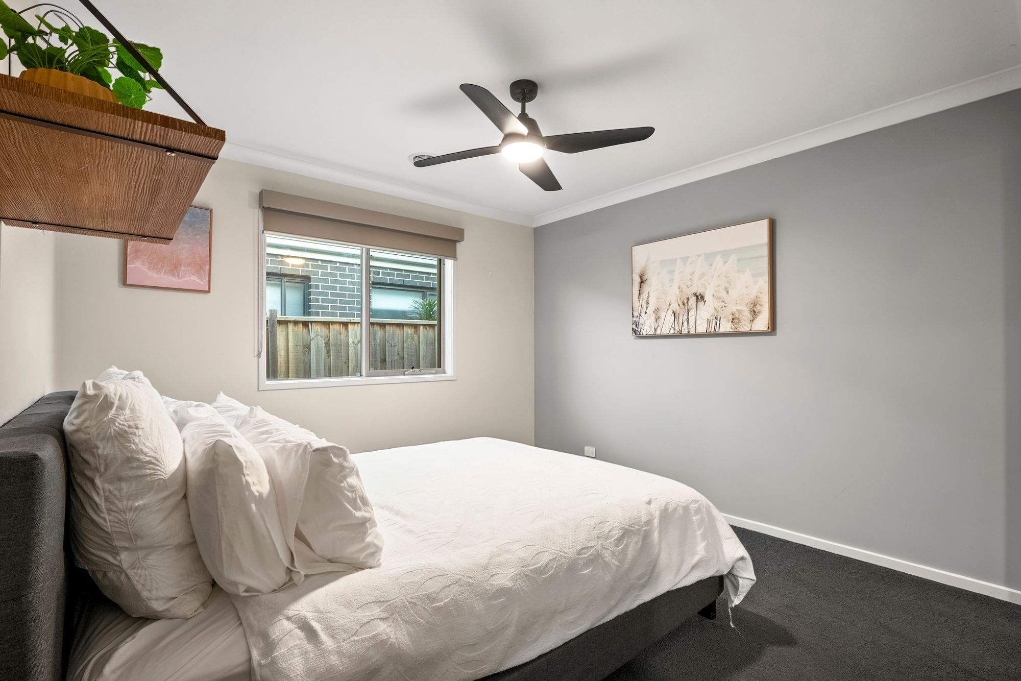 Additional Bedrooms: Queen size, carpeted, built-in sliding robes, ceiling fan with light, ducted heating, on of the minor bedrooms featuring a custom-built-in chest of drawers, and a window with roller blinds
