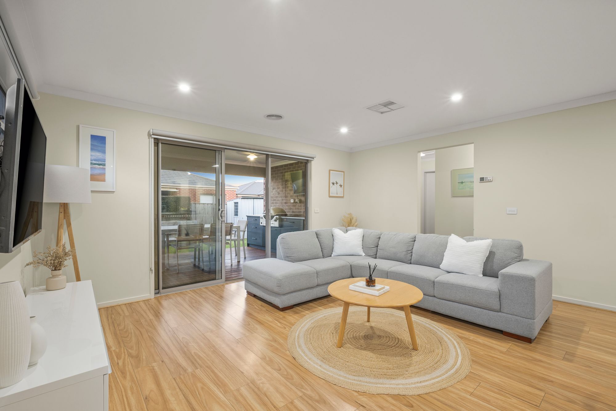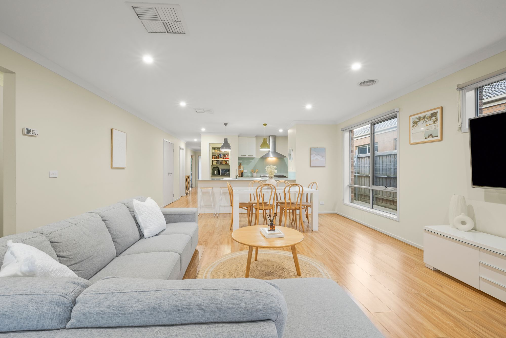 Living & Dining: Expansive open-plan kitchen/living/dining, high ceilings, ducted heating & evaporative cooling, downlights, timber laminate flooring, sliding glass doors open to outdoor alfresco, creating indoor/outdoor flow
