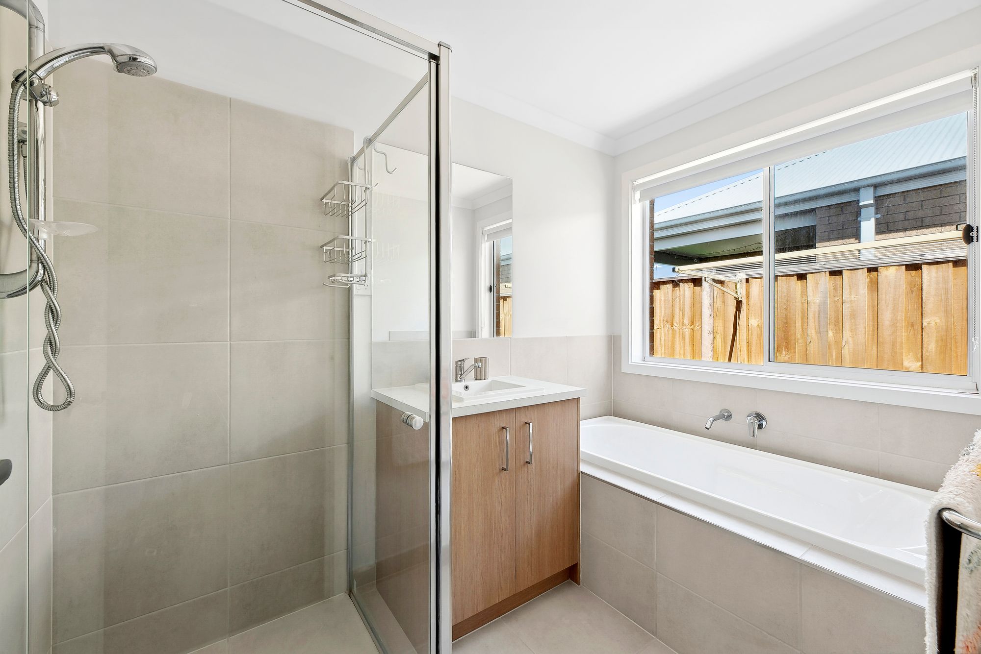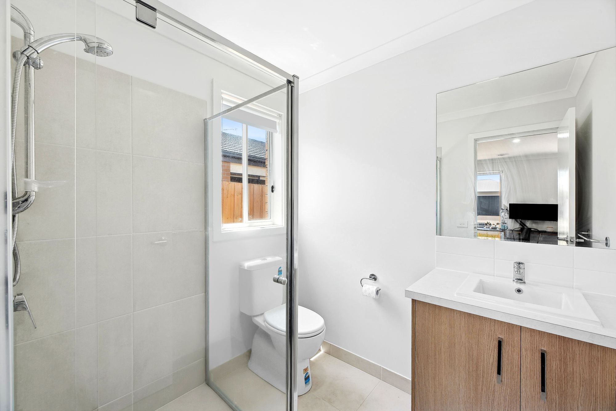 Main bathroom: Tiled, semi frameless shower, single basin and vanity with extended mirror splashback, laminate benchtops, chrome fittings, separate toilet