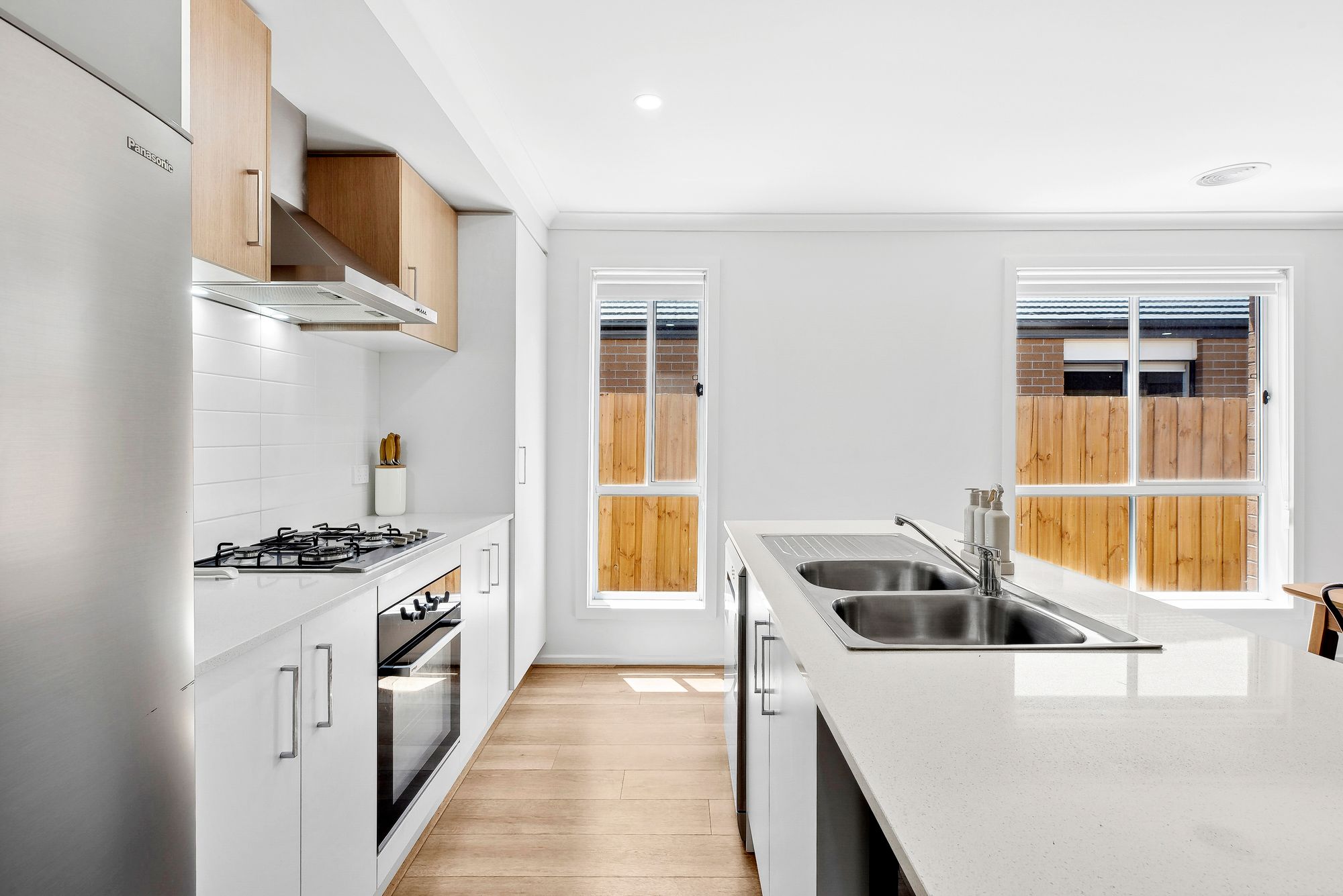 Kitchen: Open plan, 20mm stone benchtops throughout, island bench with breakfast bar with breakfast bar overhang, 900mm gas cooktop/oven/rangehood, thoughtfully designed cabinetry throughout, neutral tile splashback, double sink, pantry, ample shelving, timber laminate flooring and downlights