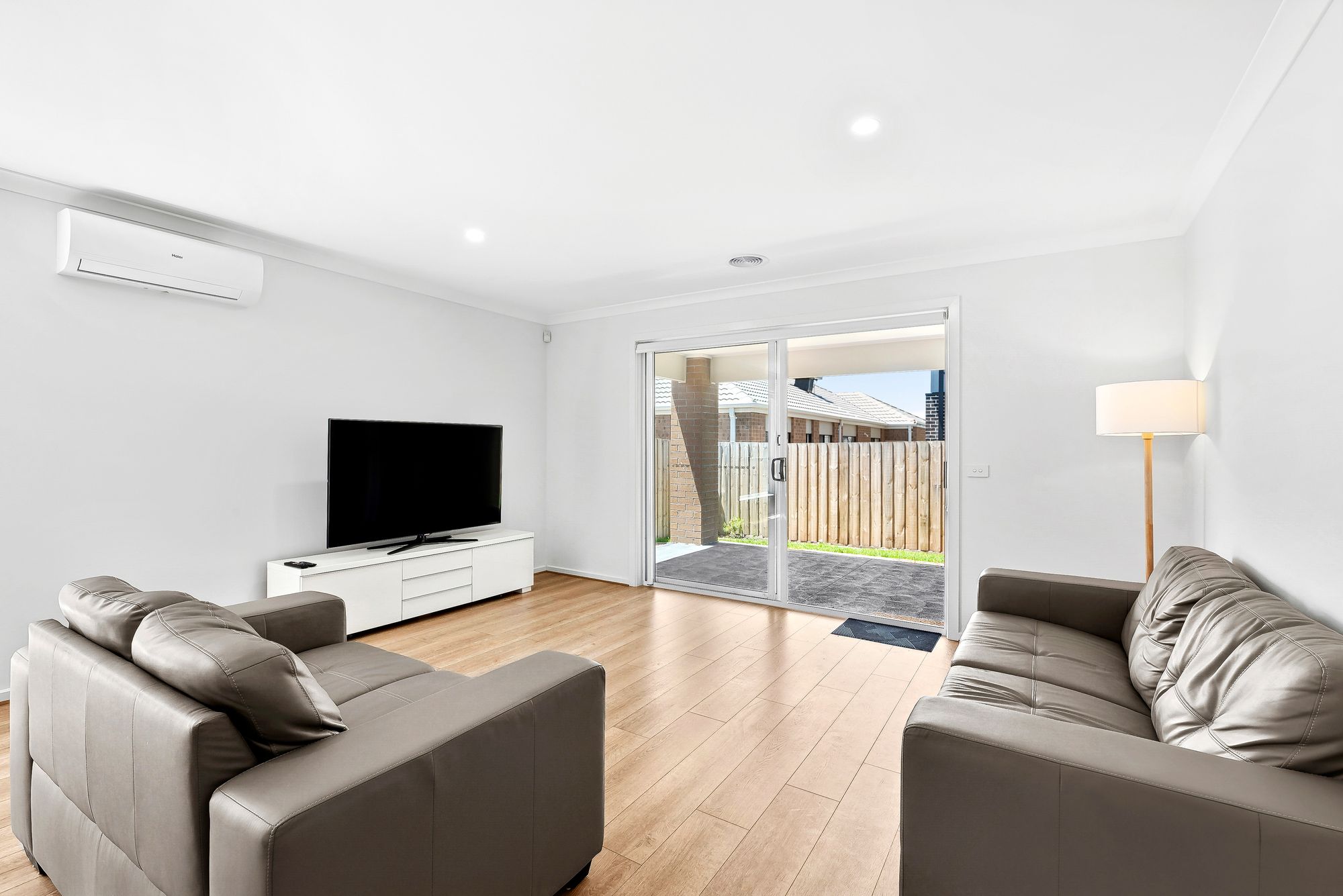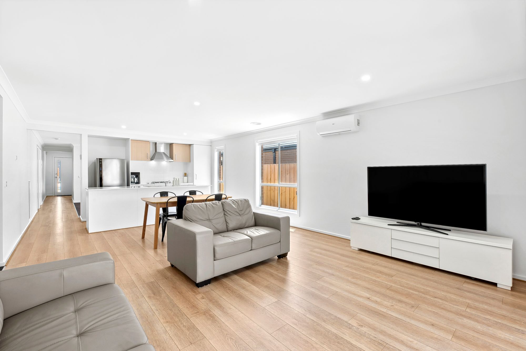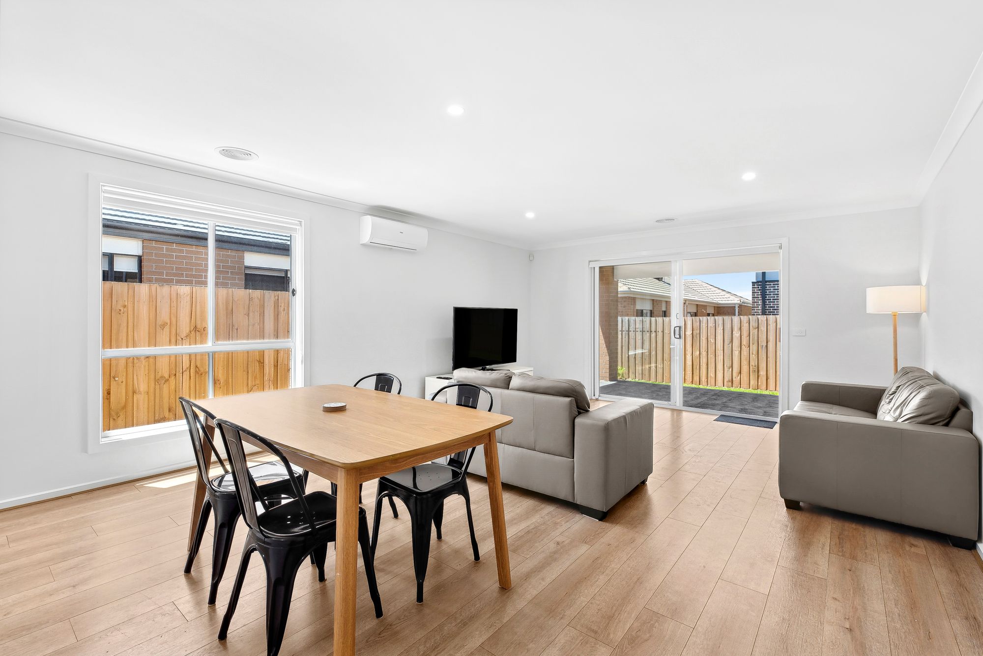 Living/Dining: Open plan, ducted heating, downlights throughout, timber laminate flooring, north facing windows with roller blinds, sliding glass doors open to outdoor alfresco creating an indoor/outdoor flow