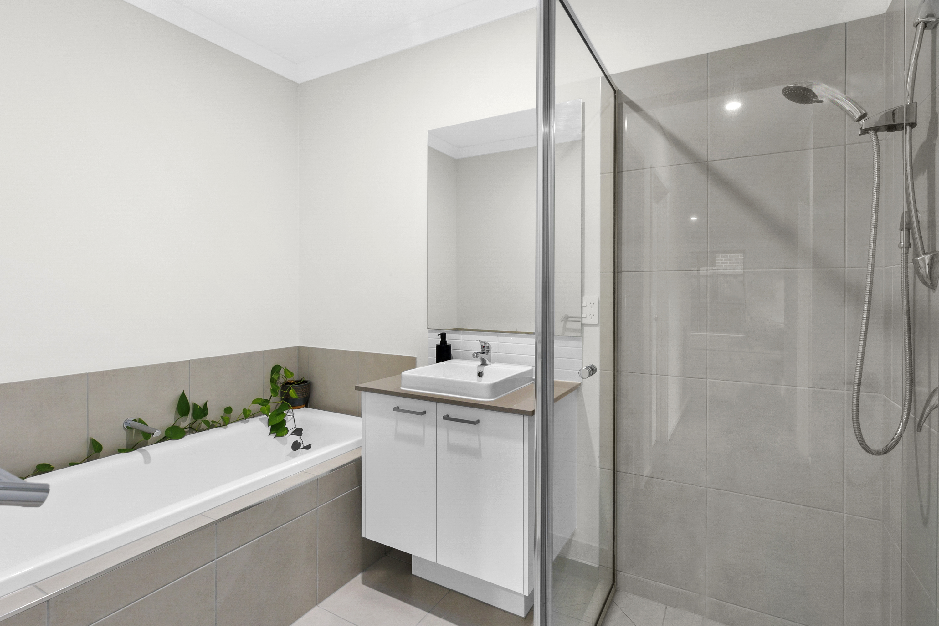 Main bathroom: 20mm stone benchtop, single basin and vanity, semi frameless shower with hand-held shower head, bath, tiles, mirror and tile splash back