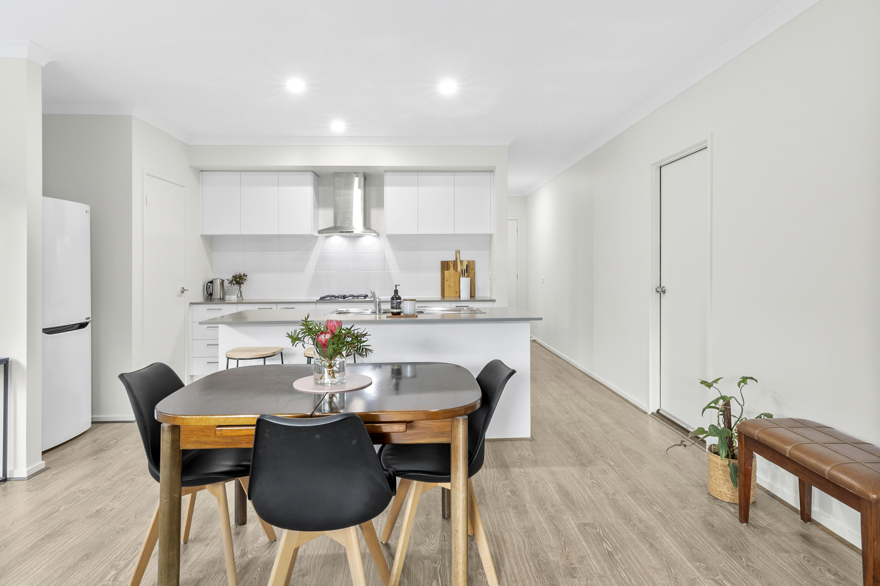 Living area: open plan kitchen/living/dining, expansive dining space, downlights, timber laminate flooring, ducted heating, roller blinds, sliding glass doors through to sun-exposed alfresco and west-facing backyard