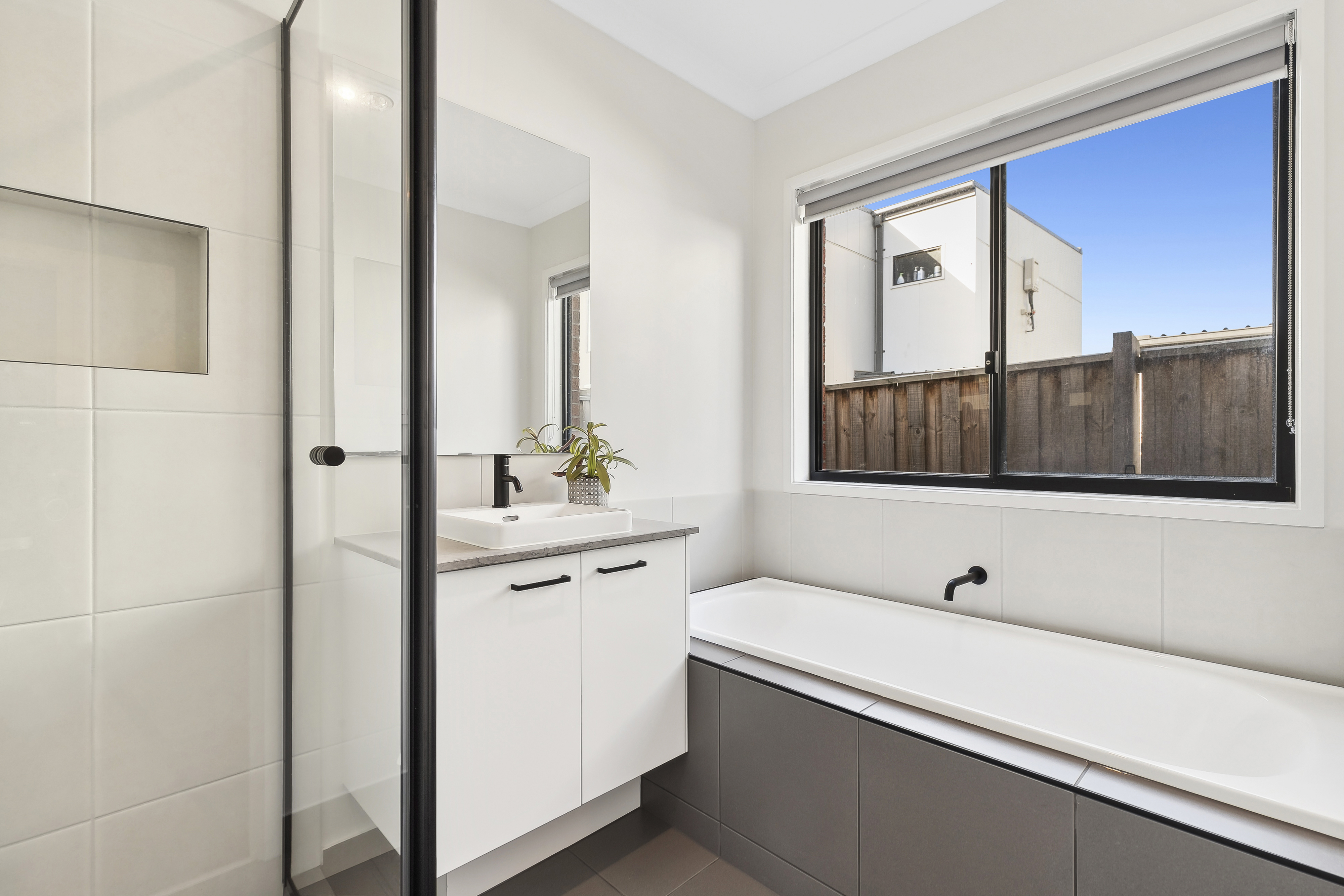 Main bathroom: basin & storage vanity, semi-frameless shower, chrome tapware & fittings, bathtub, tiling & separate toilet.