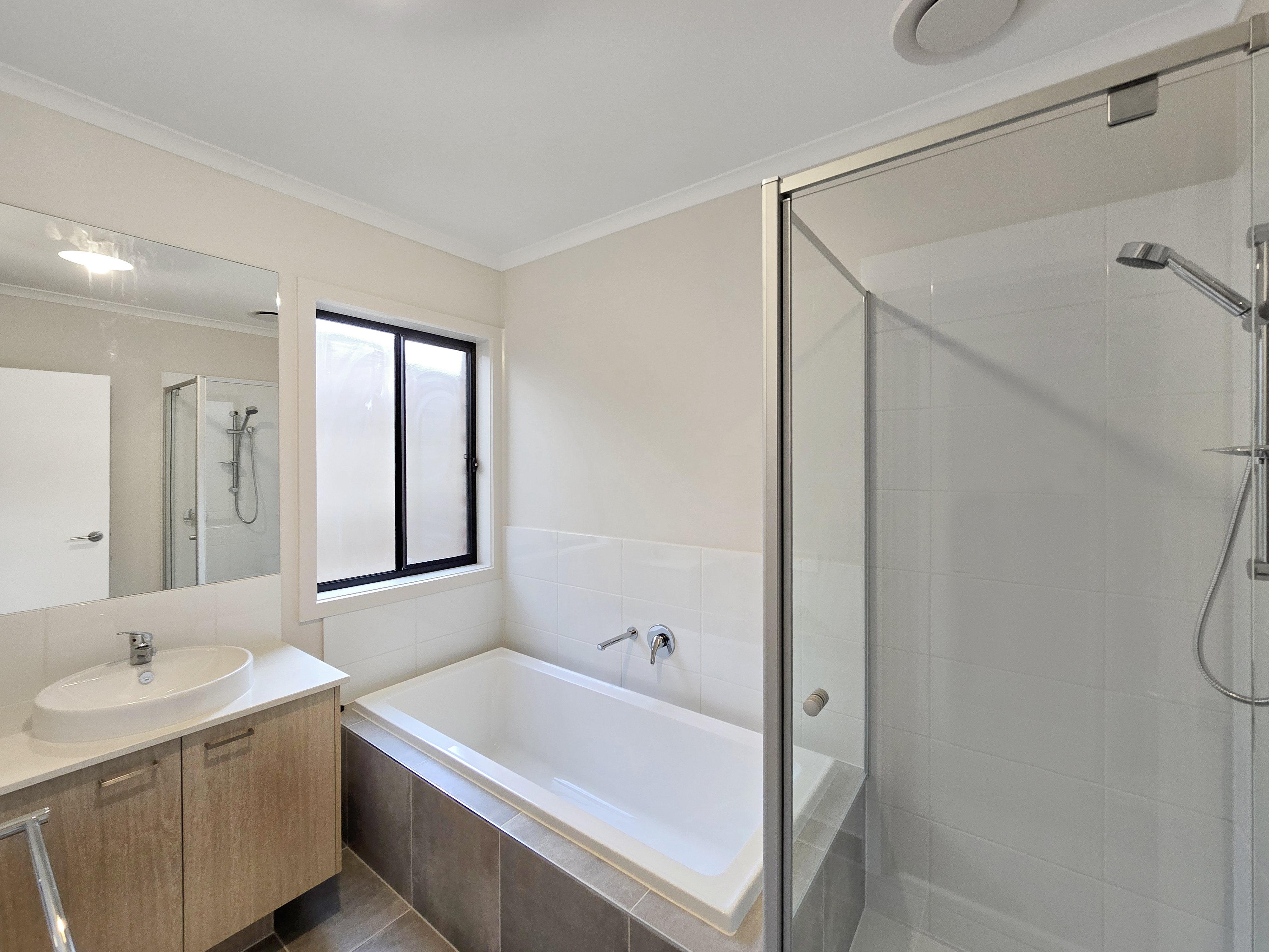 Additional Bathroom: Effortlessly servicing the household and the three bedrooms surrounding, the secondary bathroom homes a single basin on a stone benchtop vanity with tiled/mirrored splashback, tiled shower with handheld and wall mounted showerhead, raised bath and separate toilet.
