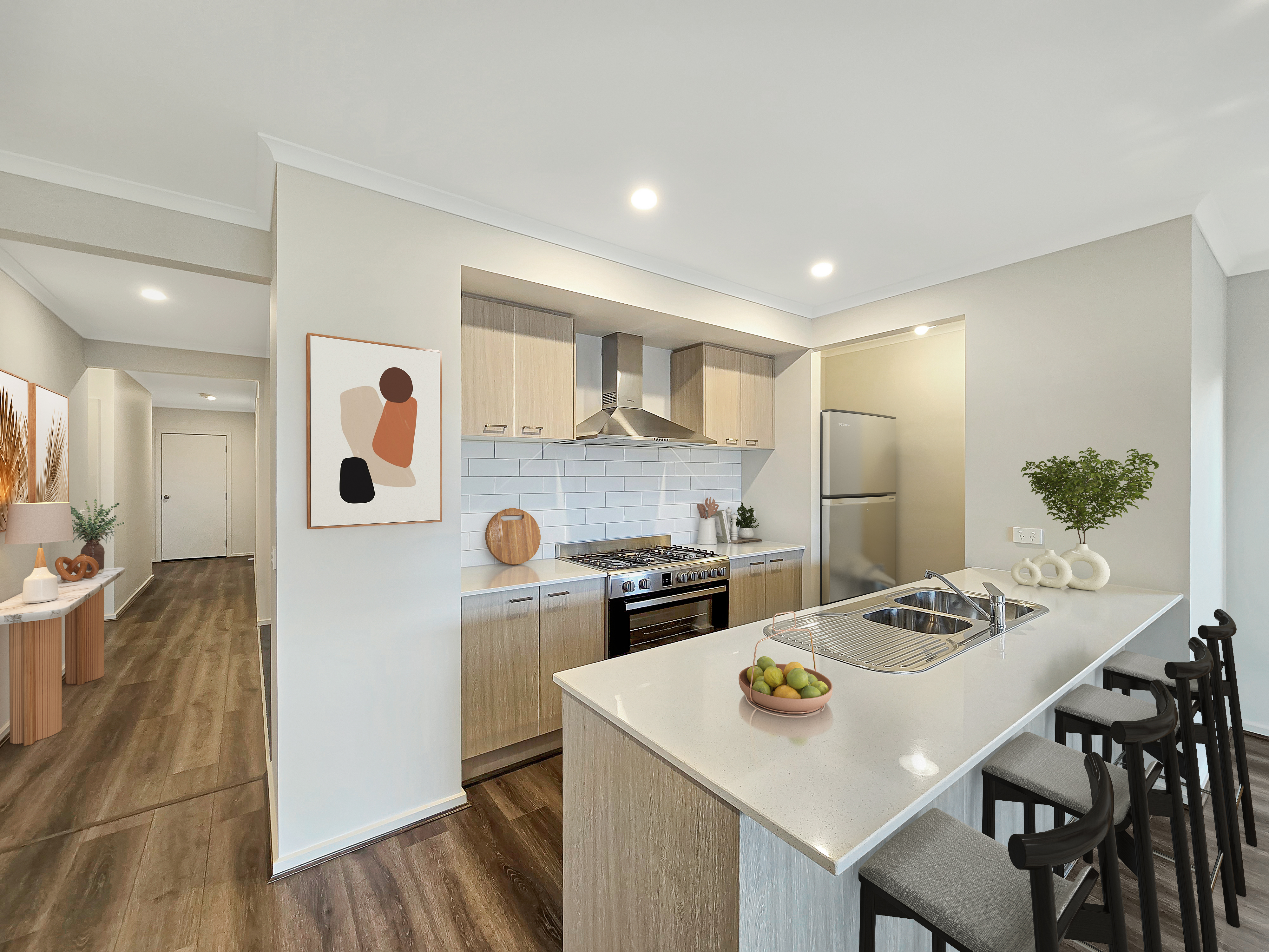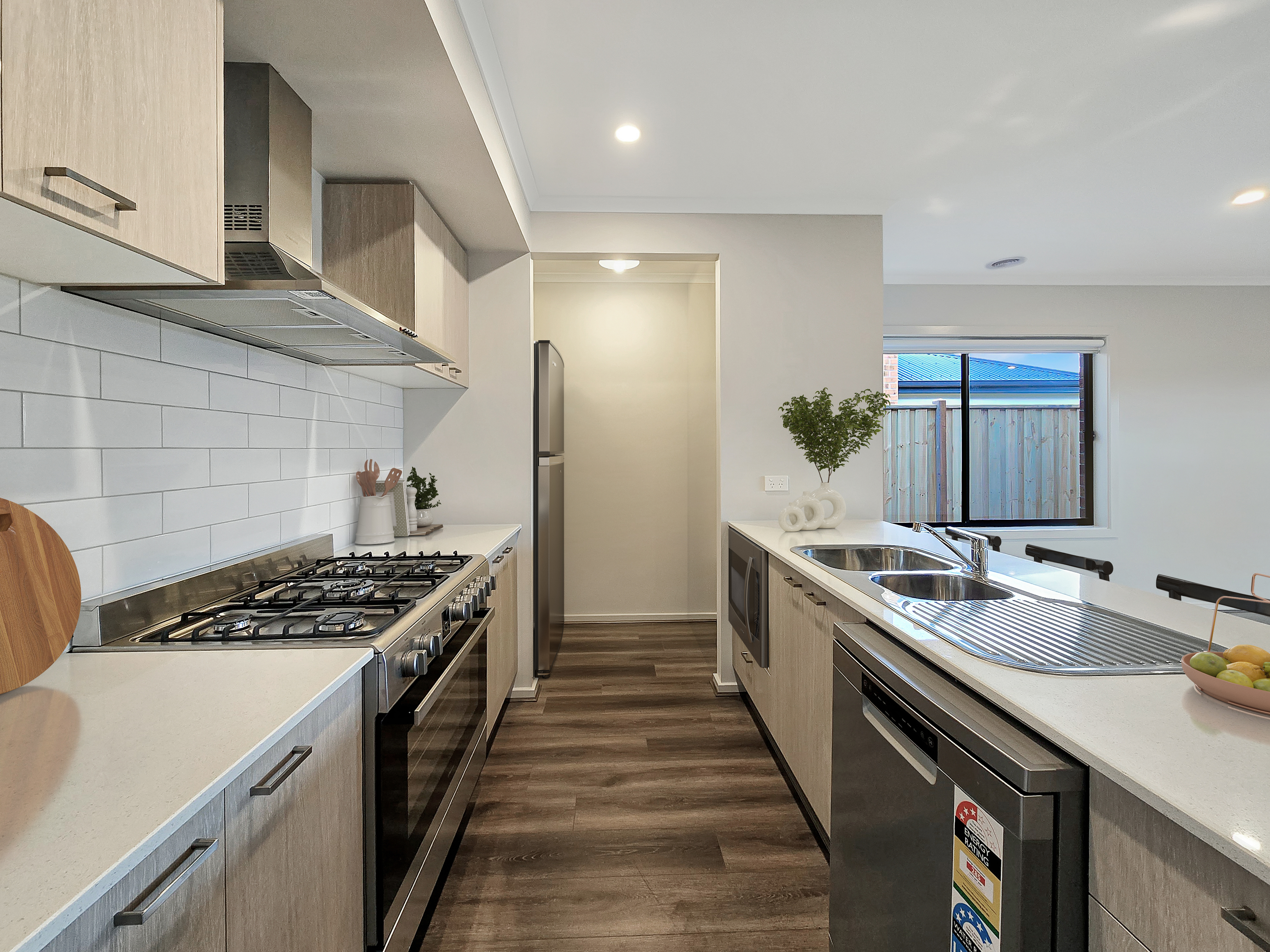 Kitchen: Walk-in pantry with a plethora of storage options and large fridge cavity, generously sized kitchen benchtops with 20mm stone, breakfast bar overhang and stainless-steel sink, downlights, overhead storage, dishwasher as well as freestanding 900mm oven and stovetop, ducted heating and split-system cooling.