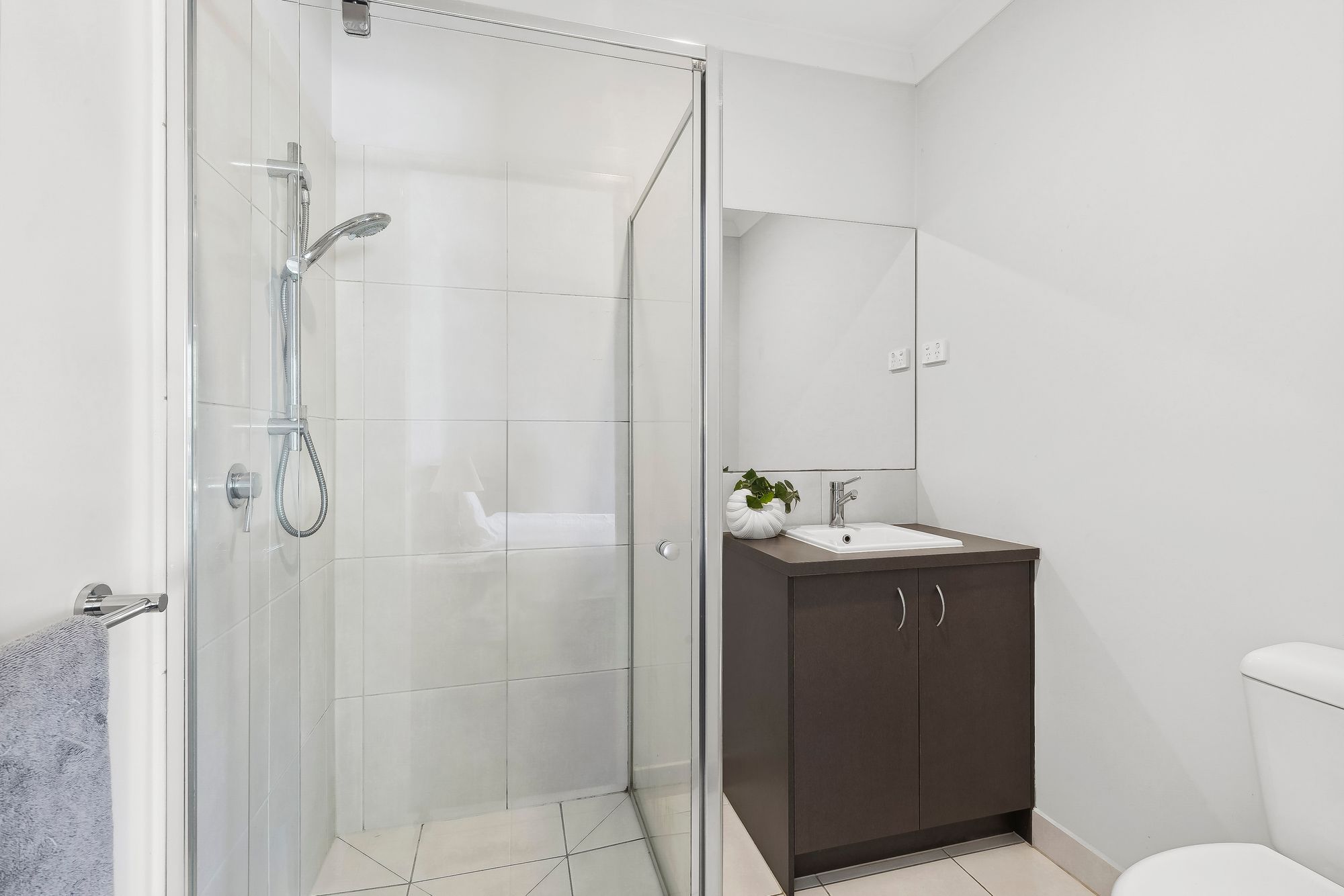 Ensuite: Single vanity, semi frameless shower, toilet, roller blinds