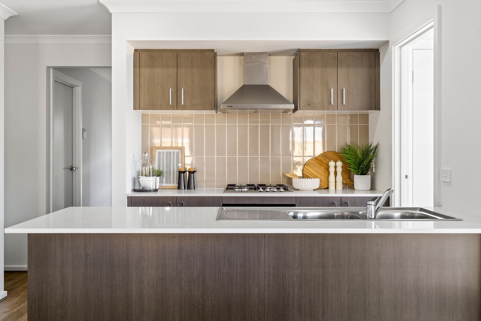 Kitchen: Cook and entertain in style with a sleek 20mm stone benchtop featuring a breakfast bar overhang. The kitchen is equipped with a 600mm oven and stovetop with rangehood, a dual chrome sink, a dishwasher, and a spacious fridge cavity. Ample cabinetry and a generously sized built-in pantry with plenty of shelving provide excellent storage space. The stunning vertical stack bond tile splashback adds a modern touch, creating a striking focal point. The kitchen is finished with stylish laminate timber flooring, adding warmth and character to the space.