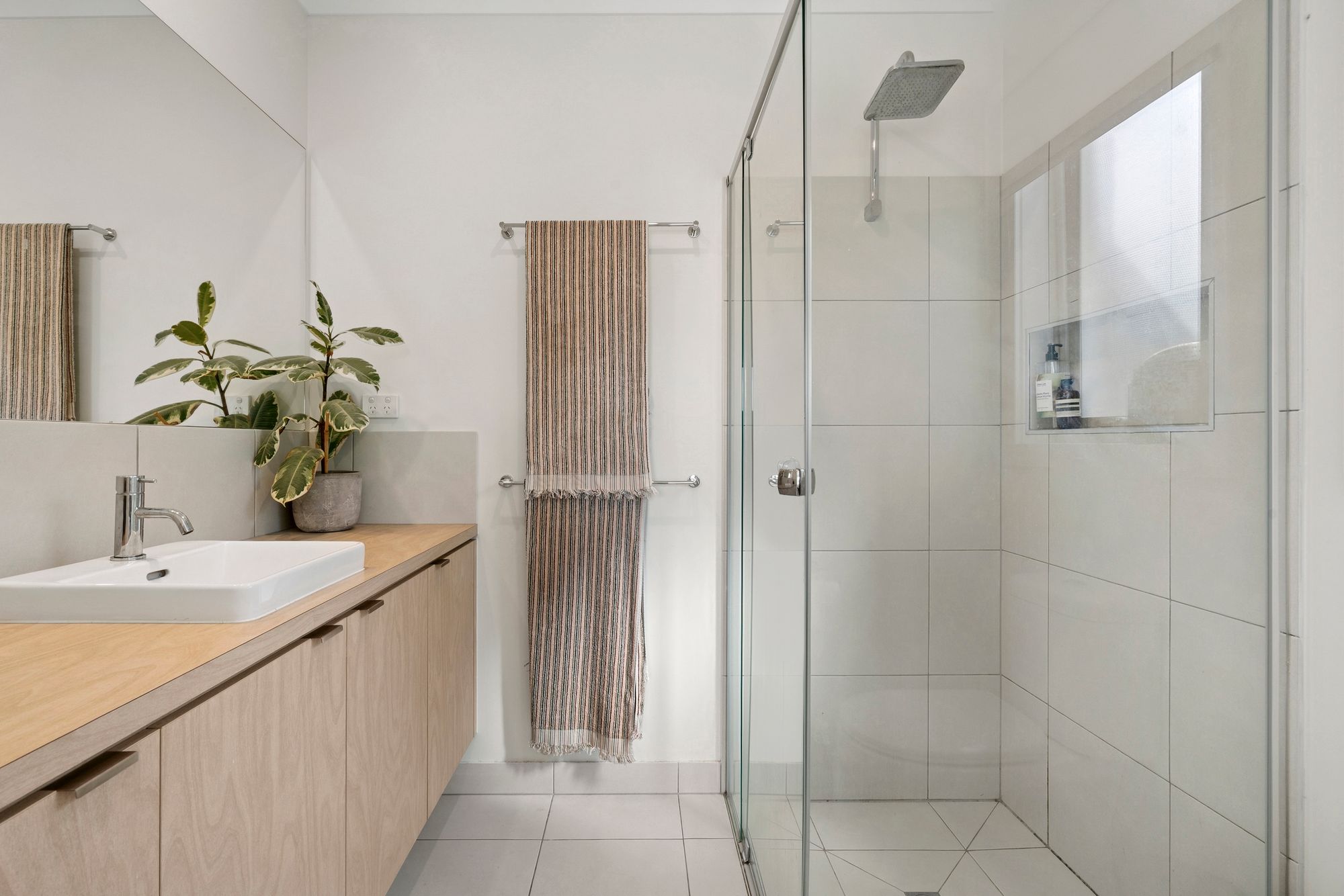 Main bathroom: semi frameless shower with niche, bath, tiles, basin and vanity, tile and mirror splashback.
