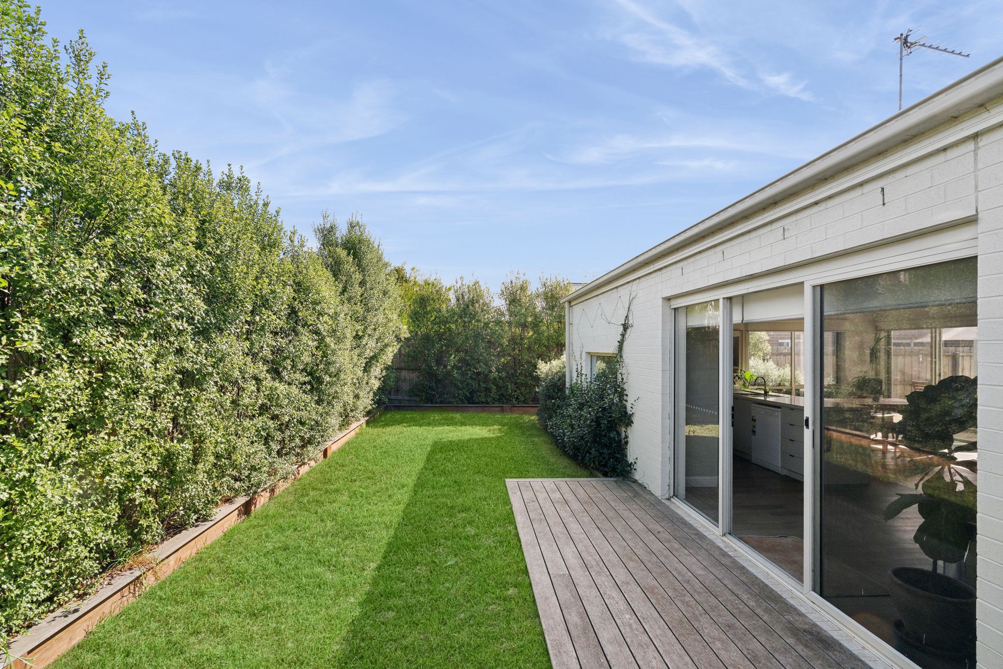 Outdoor: sliding glass doors leading to outdoor alfresco with deck, exposed aggregate concrete driveway, well-maintained grass, established greenery and garden bed, established trees providing privacy, landscaped front yard, side gate access and internal garage access.