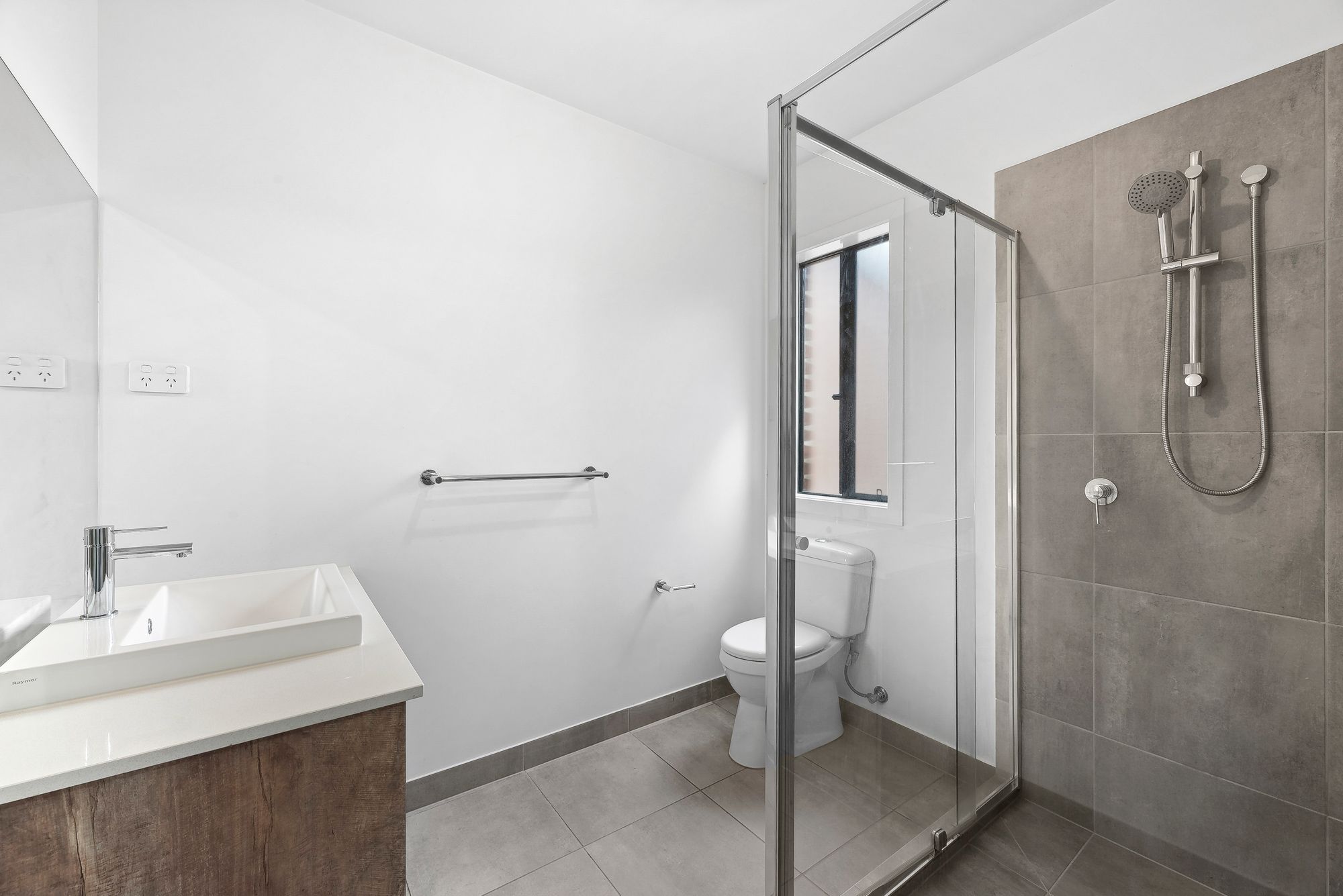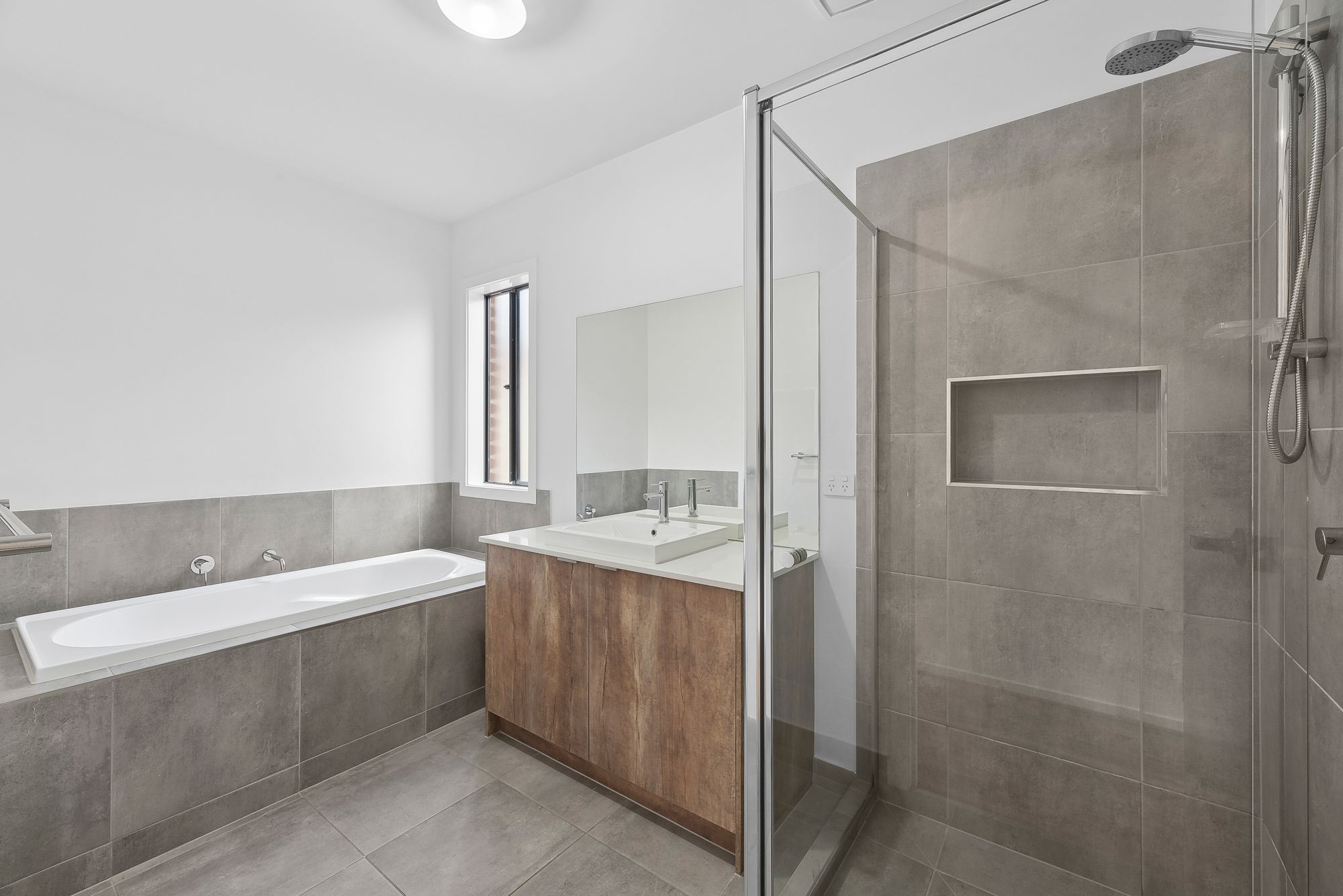 Ensuite: 20mm stone benchtop with storage underneath, frameless mirror, single shower with niche, single basin, chrome fittings