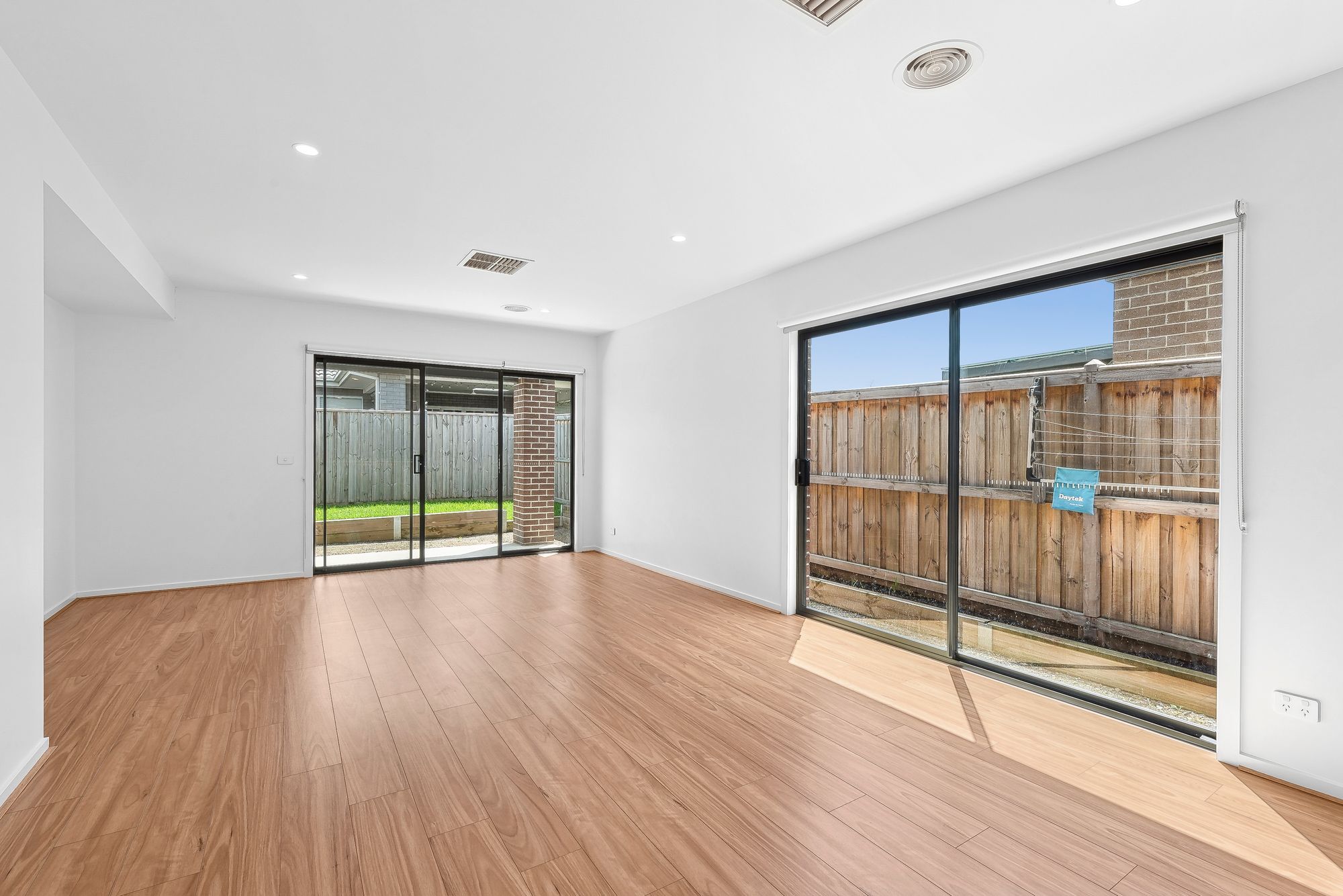 Living/Dining – Open plan living adjoining kitchen, floorboards, windows with roller blinds, ducted heating, ducted cooling, downlights, sliding door – connecting to outdoor area