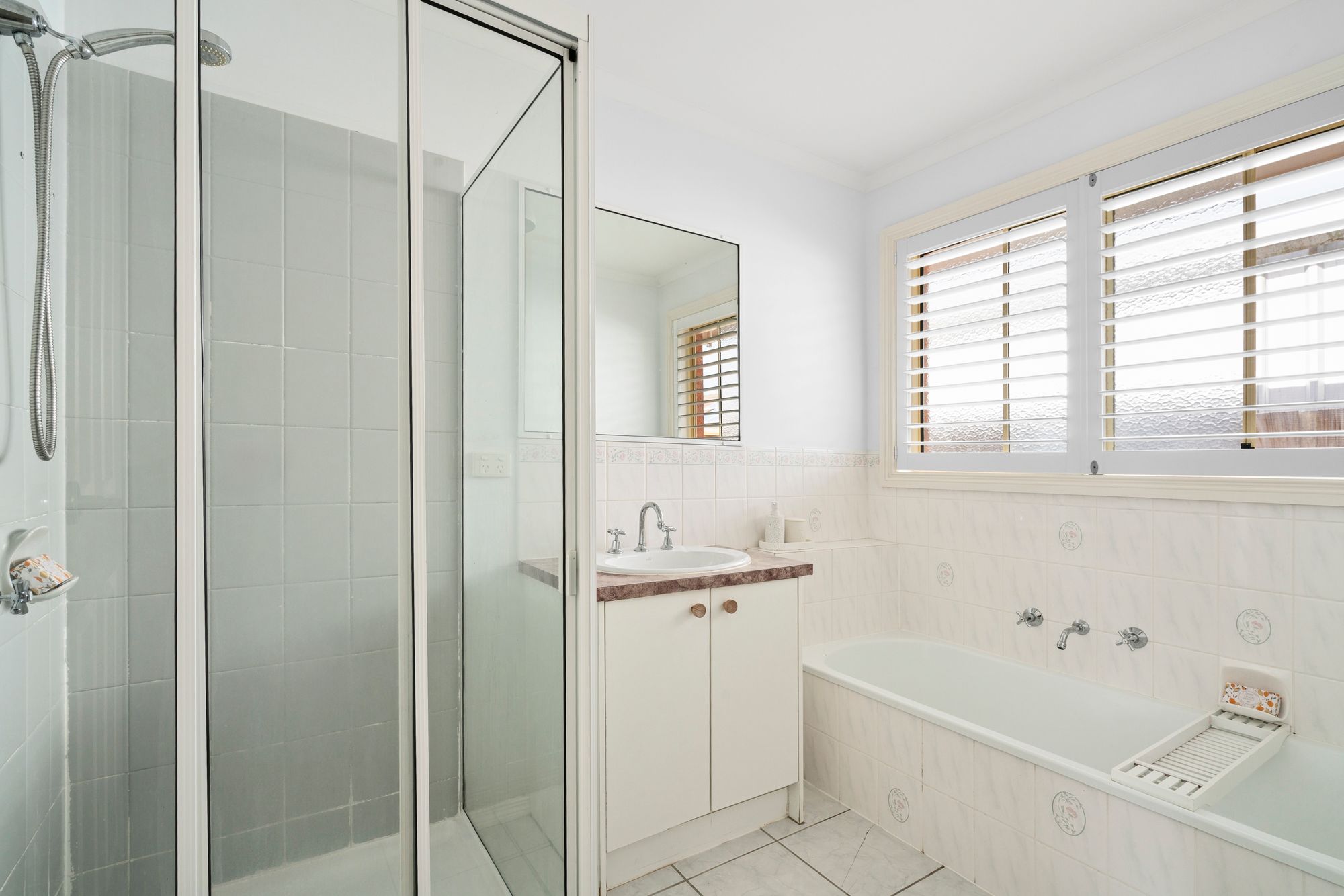 Main bathroom: Semi frameless shower, bath, tiles, tile splash back, single basin and single vanity, window with plantation shutters, chrome fittings and tapwear, separate toilet, towel rail.