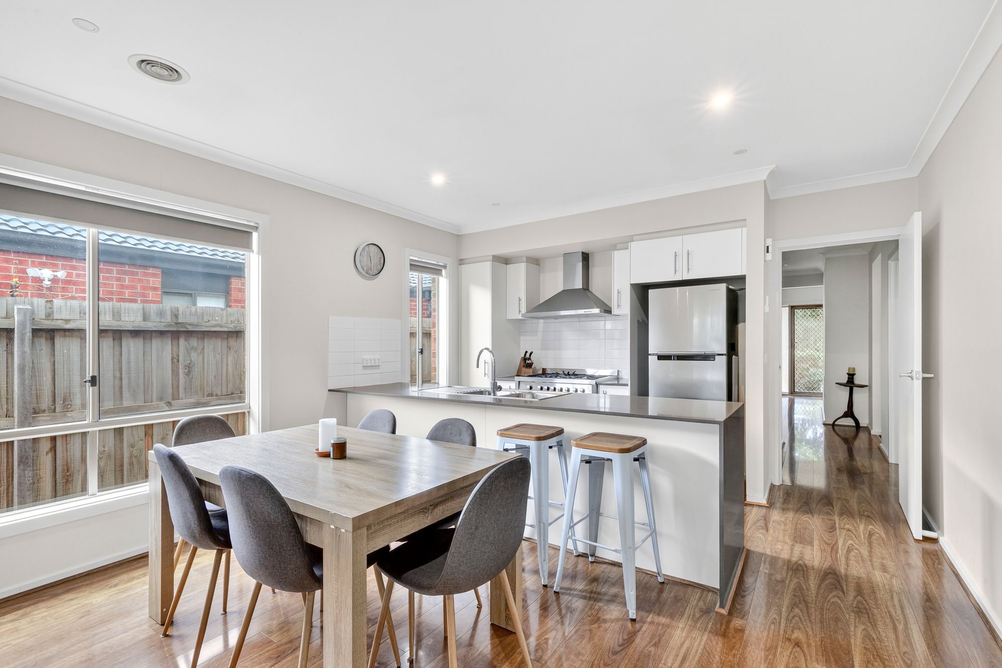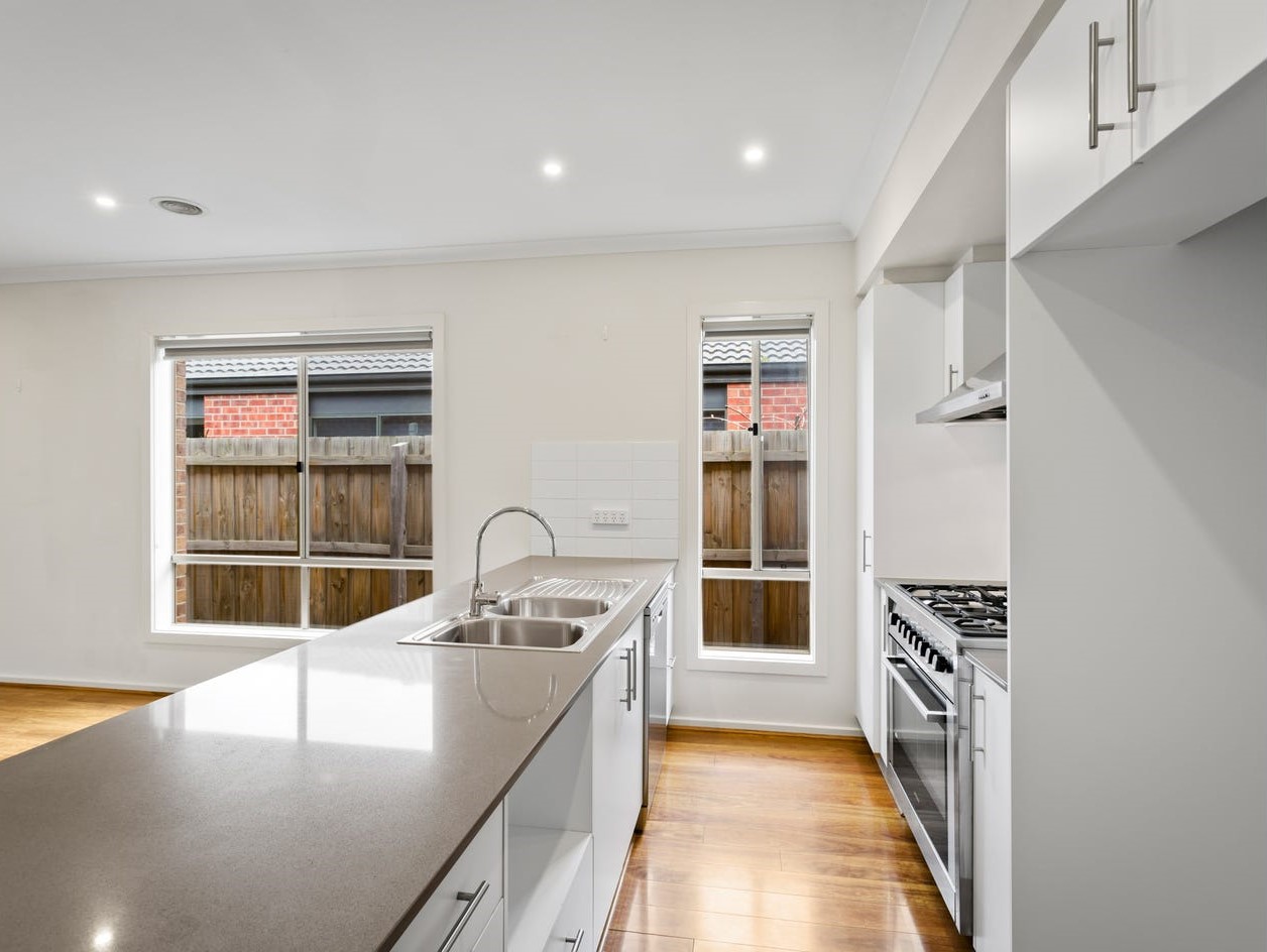 Kitchen: 900mm stainless steel appliances, 20mm stone benchtops, fridge cavity, feature window, tiled splashback, overhead cabinetry, double sink, built-in pantry, floorboards, downlights.