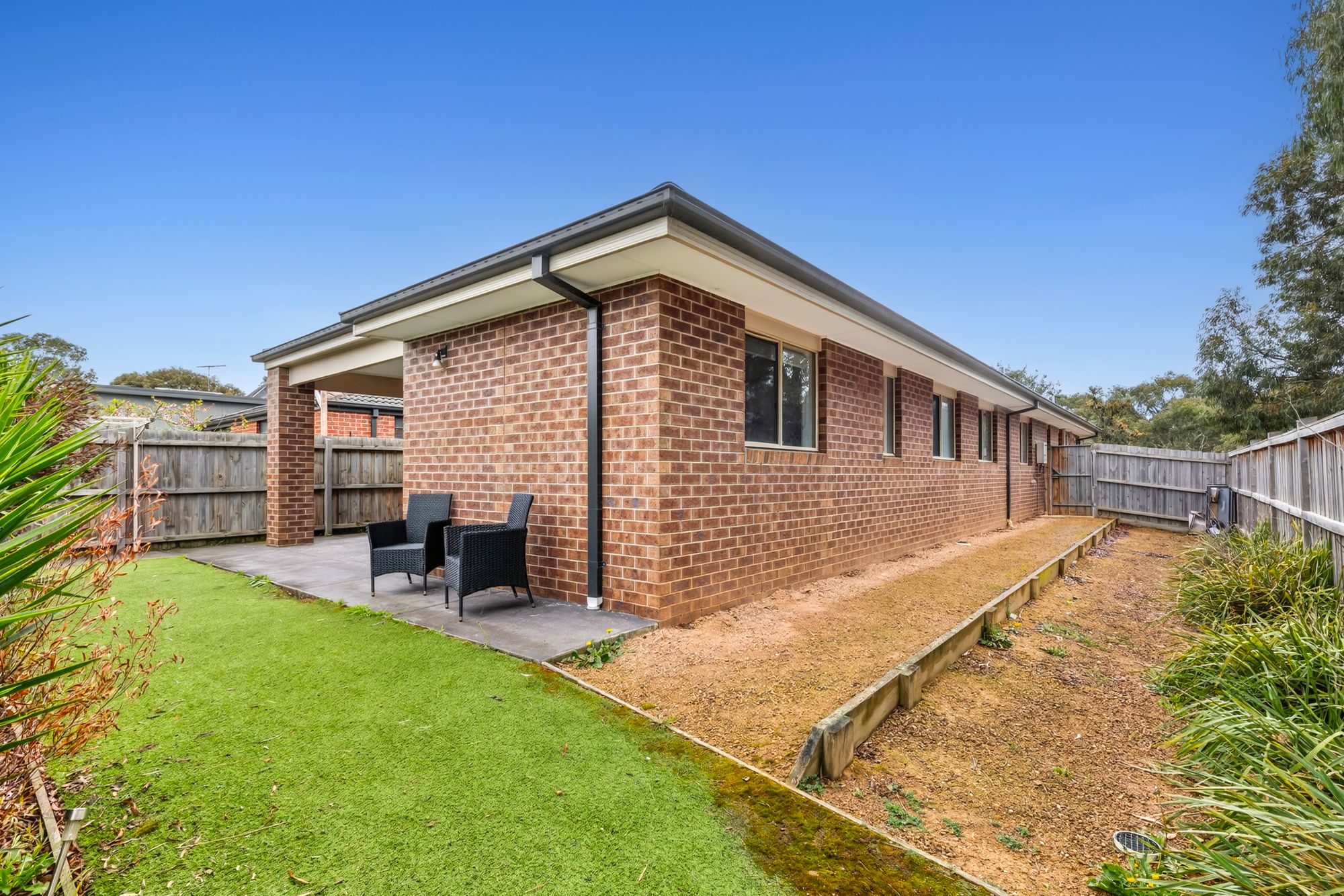 Outdoor: Sliding door access to backyard, concrete pad, ceiling fan, synthetic turf area, concrete path, clothesline, side gate access.