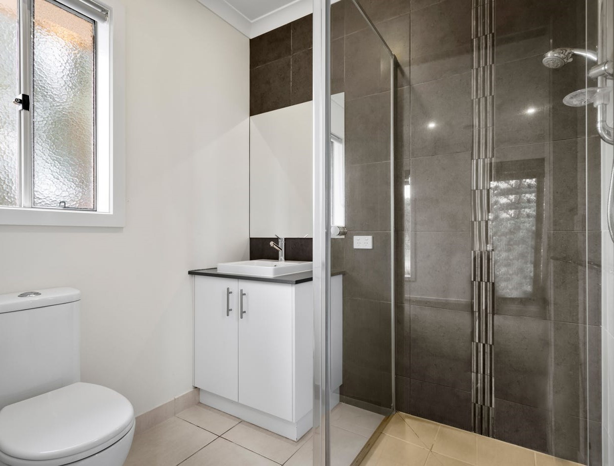 Ensuite: Semi-frameless shower, 20mm stone benchtop, single vanity with ample storage, open toilet.