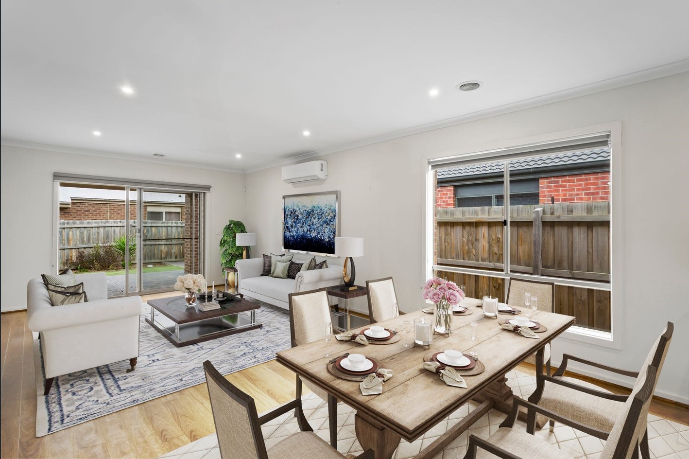 Living/Dining: Open-plan layout, floorboards, sliding doors to undercover alfresco, split system air conditioning, ducted heating, downlights, TV points.